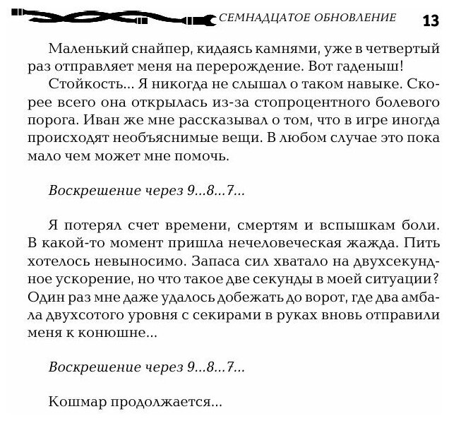 Впечатления от книги очень двоякие. С одной стороны интересный сюжет и то как ГГ берет квесты (с полным разворотом истории) очень радует. Но для меня оказалось слишком много игровых вставок(уровень и очки навыков и тд) Книги по играм мне очень нравятся, но тут...дочитав книгу теперь думаю, стоит ли продолжать? Тем кто любит повыщитывать с ГГ показатели, книга должна очень понравиться.