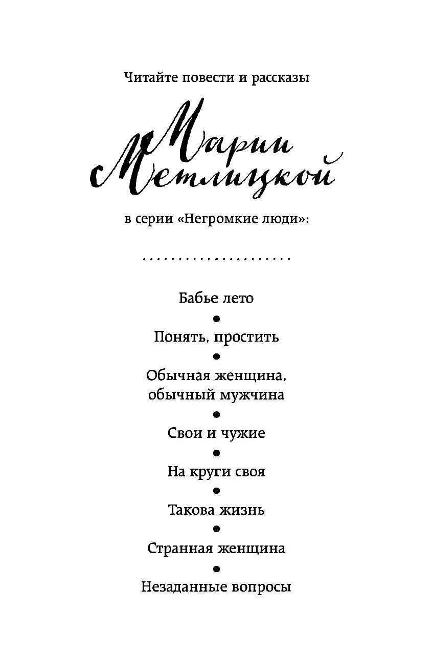 Книга из серии "Негромкие люди.." Состоит из трех ранее выходивших новелл в серии "За чужими окнами.Проза М.Метлицкой ..." Хотела заказать, но есть книга,выходившая в 2017 г. " Я буду любить тебя вечно", состоящая из новелл :1. Я буду любить тебя вечно,2. Незаданные вопросы, 3. Прощальная гастроль. Замечательное оформление книги в этот раз. Стильное и изящное! Кто не читал книгу "Я буду любить тебя вечно", очень рекомендую приобрести эту. Замечательный сборник ! Хороший вариант для подарка! Мне не все книги Метлицкой нравятся, но эти три повести,или новеллы, или маленькие романы( хоть как их назовите) - превосходные !