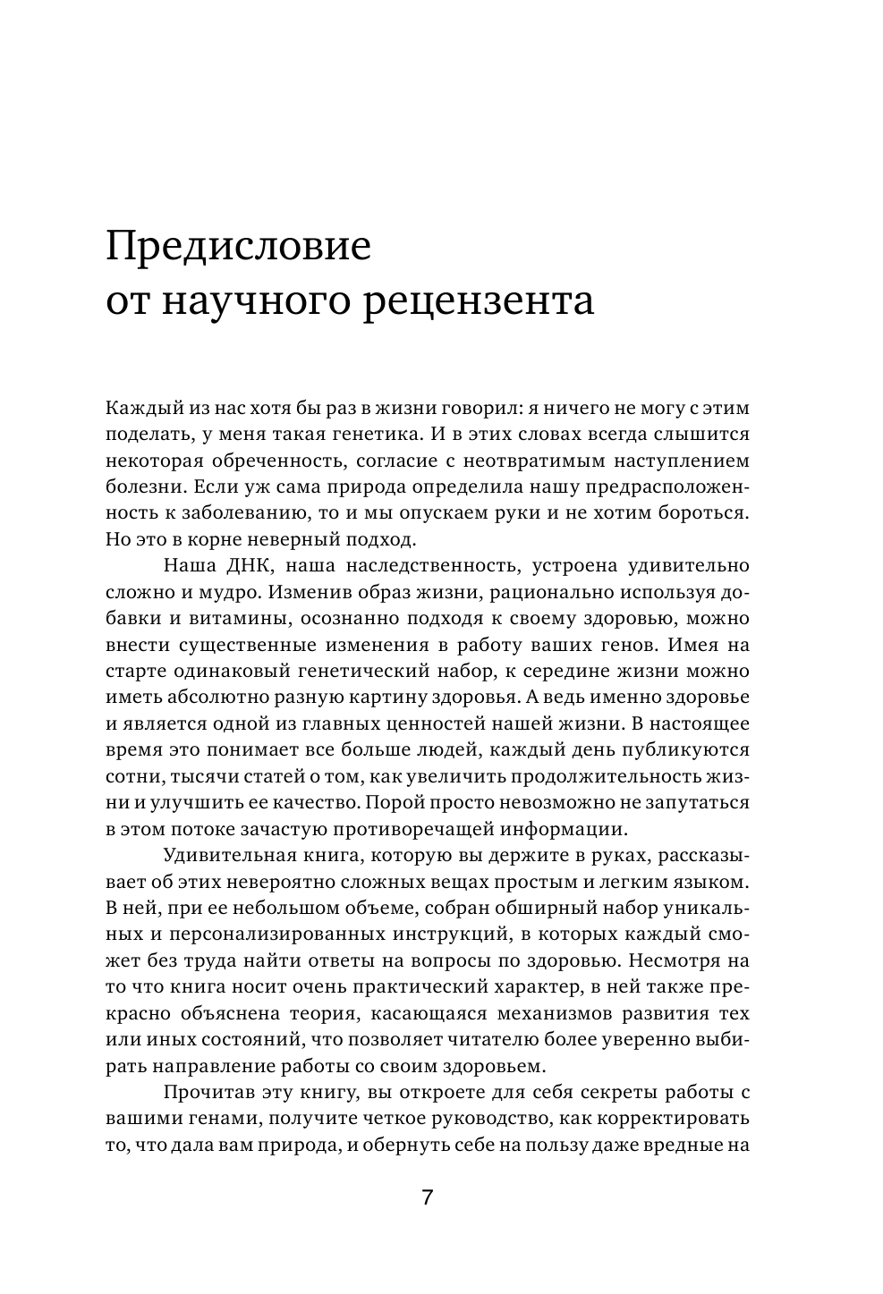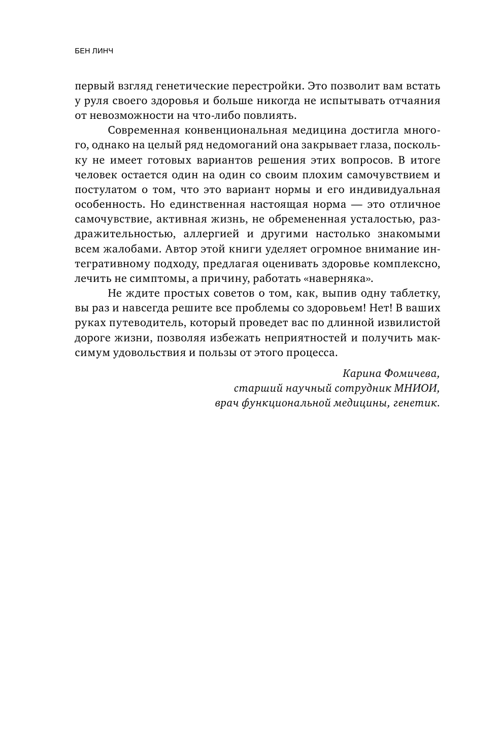 Книга написана интересно, правда в американской манере продающего автора. Не уверена, что детерминированность всех процессов в организме генной темой имеет место быть, но, читая книгу, понимаешь, что это не так важно. Даже если Бен Линч и не совсем прав, он дает общеизвестные рекомендации по оздоровлению организма. И в этом смысле ничего нового не привносит в мир Здорового Образа Жизни. Но. В его книге есть очень интересные факты про процесс метилирования и факторы, которые на него влияют. На страницах книги нашла некоторые свои проблемы, у меня возникло их понимание и видение возможных путей преодоления. Уже ради этого стоит читать книгу. В положительной оценке этого труда со стороны серьезных ученых я сомневаюсь.