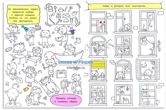 Увлекательные развивающие рисовалочки, где детям нужно не только нарисовать и раскрасить, но и посчитать диких и домашних животных, найти монстриков, проложить рыбке путь домой и сделать ещё много интересного.