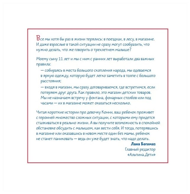Ещё одна книга из нашей любимой серии о девочке Конни. Большинство книг этой серии имеют педагогический эффект: в лёгкой, доступной форме донести до ребёнка ту или иную мысль. В этой книжке раскрывается тема безопасности в общественных многолюдных местах. Ребенок узнает, почему нельзя убегать от мамы в магазине, и что нужно делать, если всё же ты потерялся.