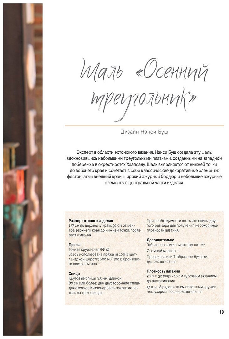 Я начинающая вязальщица,мне очень захотелось связать себе шаль.Купила данную книгу и очень довольна.В книге много разных моделей,есть из чего выбрать.Есть фотографии готовых изделий на моделях.К каждой шали идет схема вязания,расчет плотности.Даны советы по выбору подходящей пряжи и спиц.Вяжутся шали легко,все подробно объяснено.Справится даже начинающий.