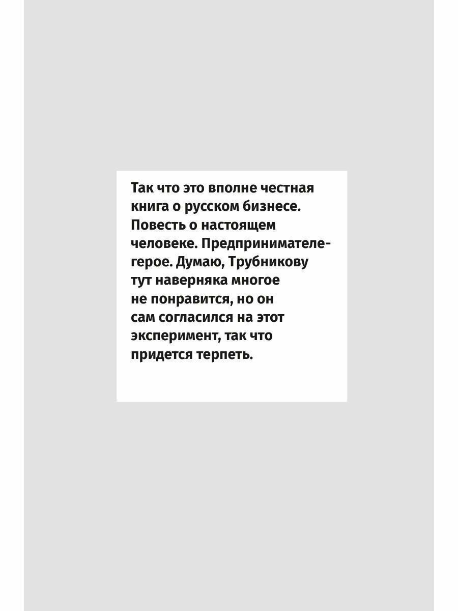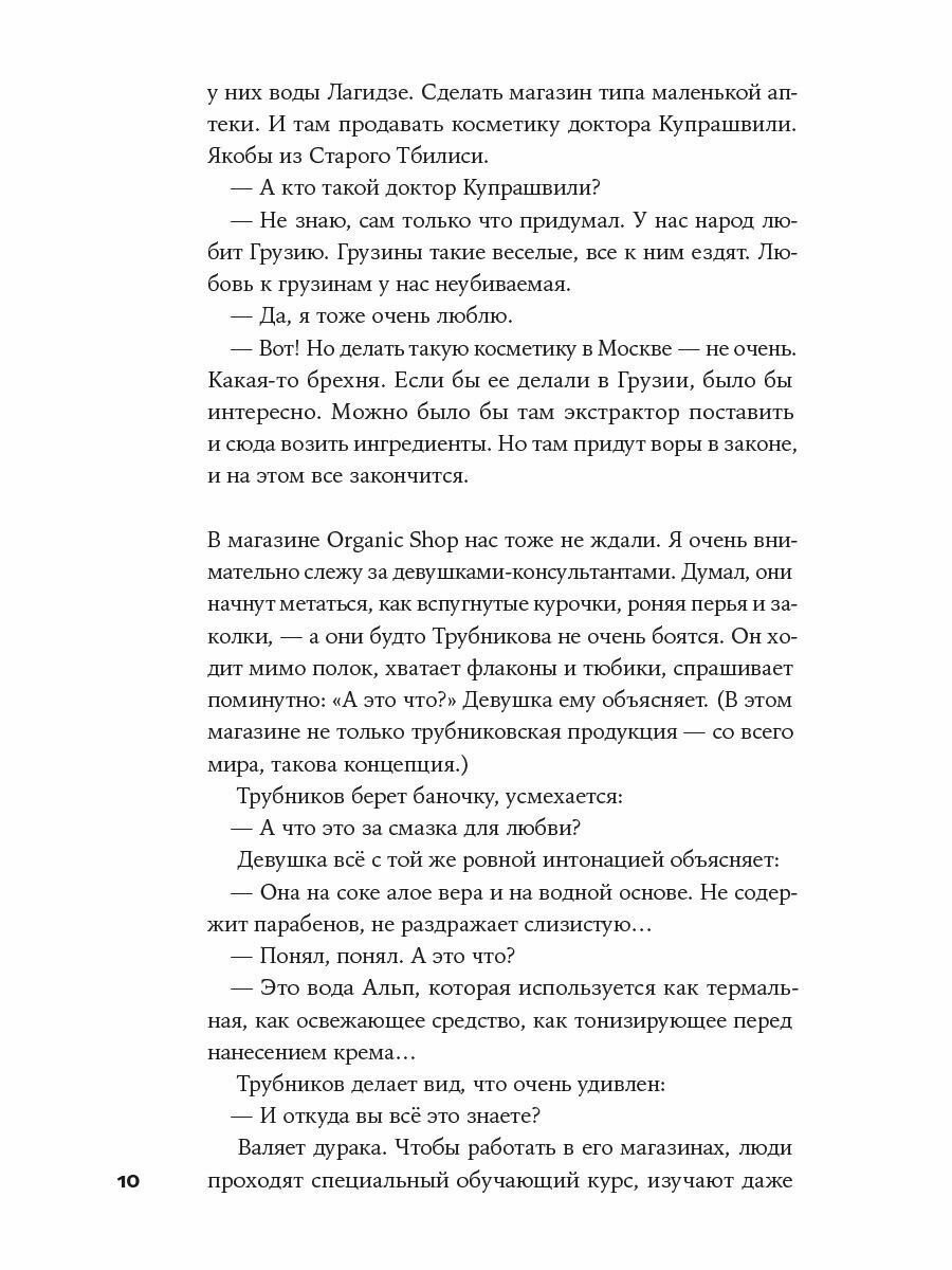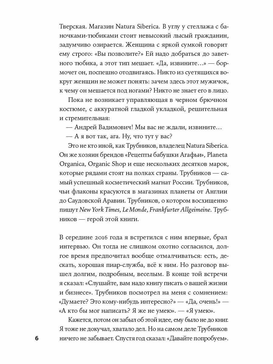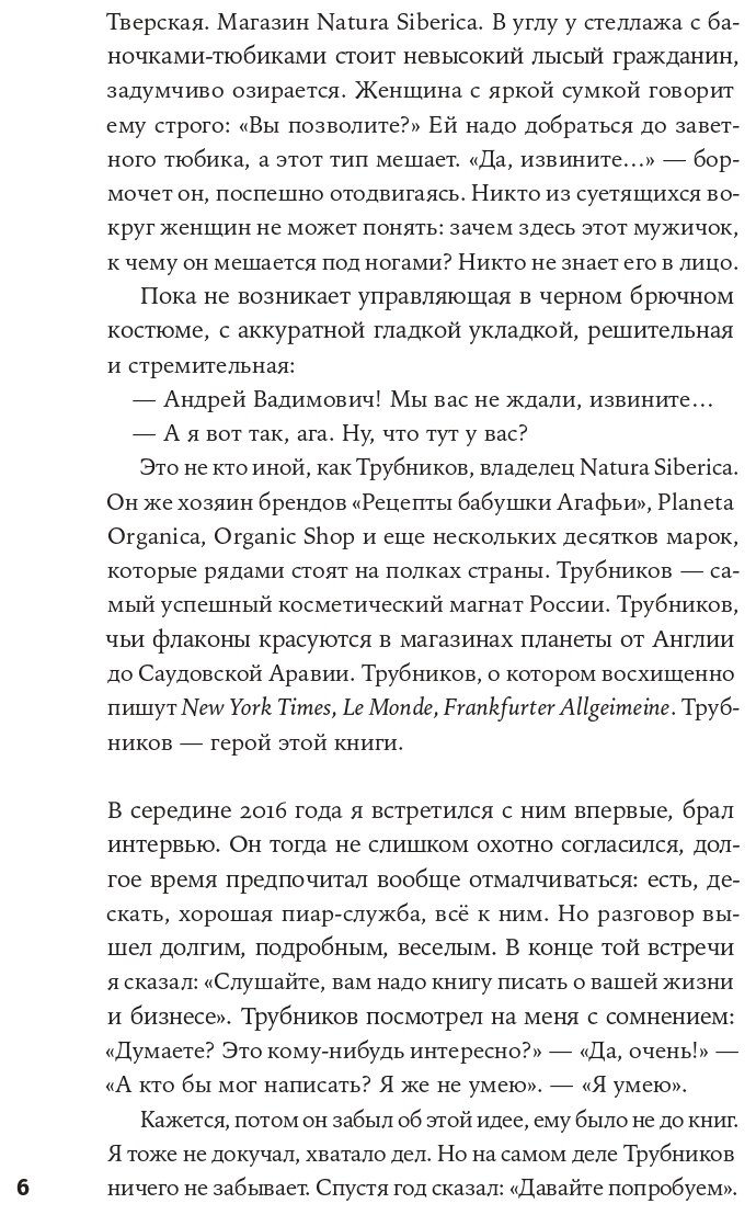 Герой книги Андрей Трубников — основатель и владелец брендов Natura Siberica, Planeta Organica, Organic Shop, «Рецепты бабушки Агафьи» и многих других. В косметическом бизнесе он оказался случайно и в зрелом возрасте, тем интереснее его история. Трубников — безусловно, авантюрист, но при этом гений маркетинга. Известный журналист Алексей Беляков выяснил, как одному из самых харизматичных бизнесменов России удалось создать мощную компанию и вывести русскую косметику на мировой рынок. Это увлекательная, на грани триллера, история развития знаменитой российской косметической компании с сильным лидером во главе. Вы узнаете, как создать крупную компанию с нуля в условиях российского рынка. Автор показывает «внутреннюю кухню» работы компании, раскрывая тайны появления на свет брендов, любимых миллионами россиян. Алексей Беляков честно и с юмором описывает формирование команды, различные ухищрения, на которые приходилось идти Андрею Трубникову ради продвижения своей продукции, и, конечно, рассказывает о нем самом — самом необычном российском бизнесмене, энтузиазм и перфекционизм которого способны заразить любого желанием создавать самую лучшую продукцию в мире.Для широкого круга читателей.