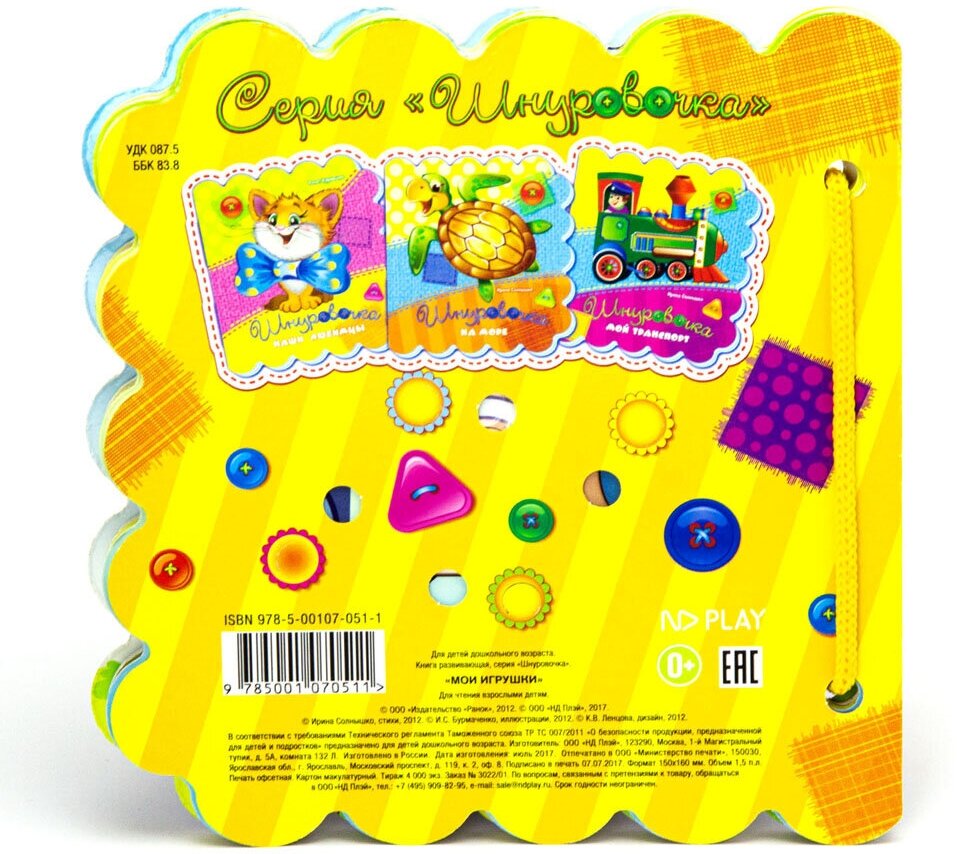 Книжки серии "Шнуровочка" уникальные в своём роде: в них вы найдёте развивающую игру-шнуровку на каждой страничке, замечательные стихи и яркие запоминающиеся иллюстрации. Цветной шнурок словно кисточка с яркой краской украсит каждую картинку. Игры-шнуровки чудесно развивают мелкую моторику и сообразительность, подготавливают руку к письму и помогают развитию речи. К 10 картинкам прилагаются 5 двусторонних шаблончиков, которые шнуруются к самой книжке; оригинальное крепление на шнурке позволит разобрать книгу для игры и собрать ее после снова в любом порядке. Оригинальная игровая механика позволит надолго сохранить у вашего ребенка интерес к книге-игре.