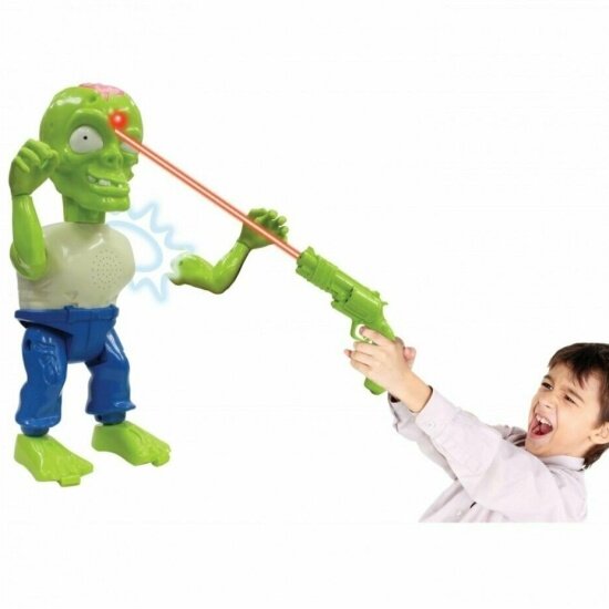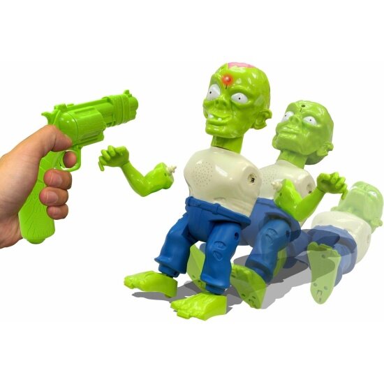 Главная задача игрока – выстрелить из специального бластера, который идет в комплекте, в светящуюся мишень, расположенную на голове зомби. После первых трех попаданий, у него отпадет одна рука. Еще через три попадания подряд скелетон потеряет и вторую руку. А еще после трех выстрелов фигурка будет поражена и упадет на пол. Если игрок промахнётся, зомби будет зловеще смеяться над ним.
