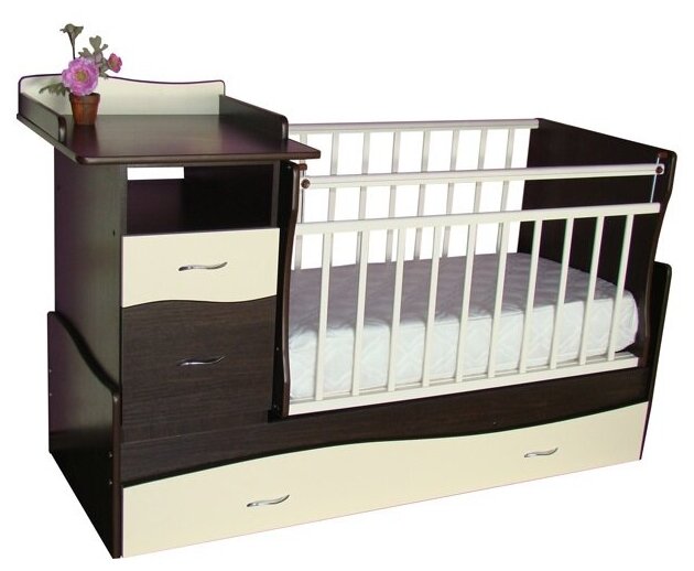 Кровать-трансформер маятник Чунга-Чанга современного цвета и дизайна совместила в себе кроватку для новорожденного (120х60см) с пеленальным столиком, кровать размером 170х60см, стол с бортиками и тумбу. Кровать имеет ортопедическое основание, вместительные ящики тумбы, большой выкатной ящик кровати (удобно для уборки), защитные накладки на решетках, опускающуюся планку. Для новорожденного ложе устанавливается в верхнем положении, в дальнейшем при опускании в нижнее положение, собирается столик. Кроватка изготовлена из дерева (сосна, береза) и безопасного ЛДСП.