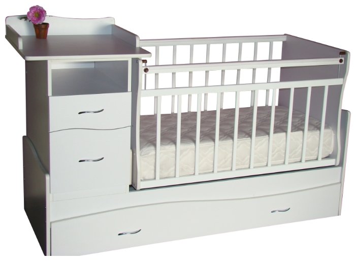 Кровать-трансформер маятник Чунга-Чанга современного цвета и дизайна совместила в себе кроватку для новорожденного (120х60см) с пеленальным столиком, кровать размером 170х60см, стол с бортиками и тумбу. Кровать имеет ортопедическое основание, вместительные ящики тумбы, большой выкатной ящик кровати (удобно для уборки), защитные накладки на решетках, опускающуюся планку. Для новорожденного ложе устанавливается в верхнем положении, в дальнейшем при опускании в нижнее положение, собирается столик. Кроватка изготовлена из дерева (сосна, береза) и безопасного ЛДСП.