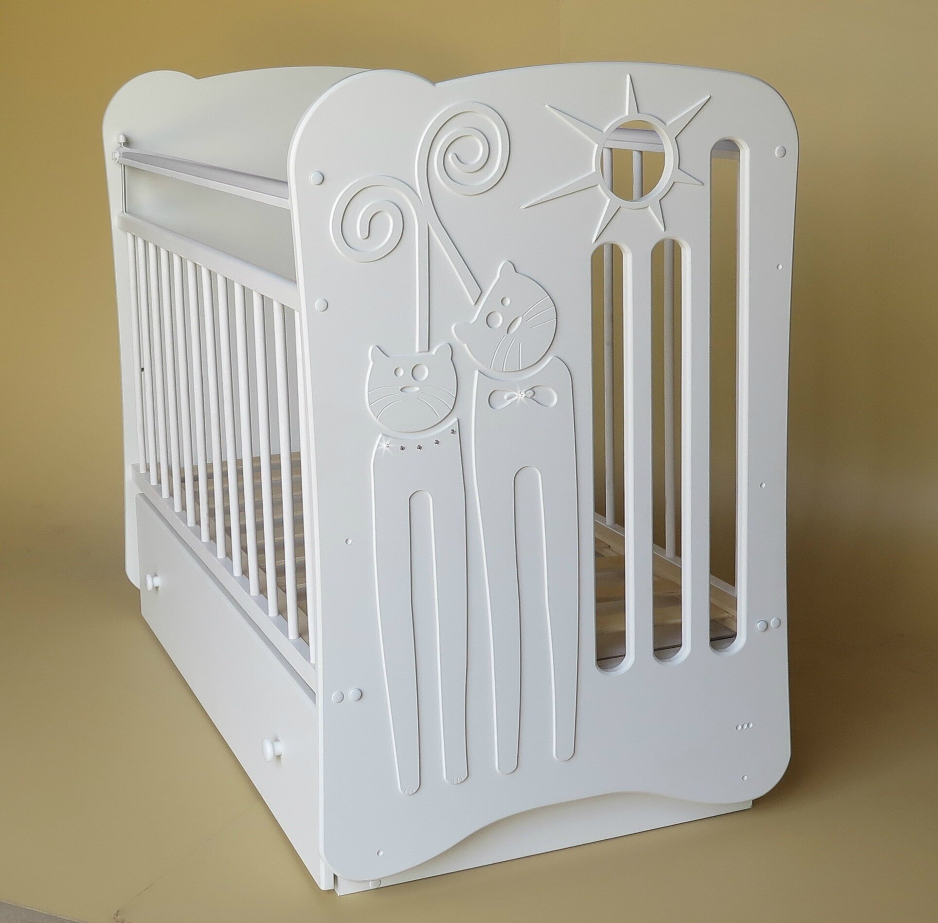 Детская кроватка Островок уюта маятник поперечный - изящная кроватка с дизайном собственной разработки. Детские кроватки для новорожденных этой серии изготовлены из высококачественных нетоксичных материалов. Практически вся кроватка изготовлена из массива березы. Только боковые спинки и фасад ящика сделаны из безопасного МДФ, украшены узорами. Вся кроватка покрыта безвредным лаком на водной основе, для того чтобы аккуратный внешний вид кроватки сохранялся как можно дольше. Для укачивания малыша в данной кроватке предусмотрен маятниковый поперечный механизм. Благодаря ему кроватка легко раскачивается, практически не издавая шума. При необходимости маятник можно зафиксировать.