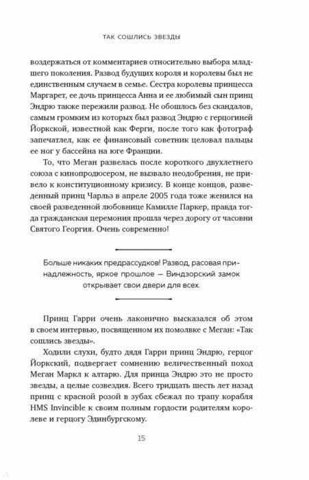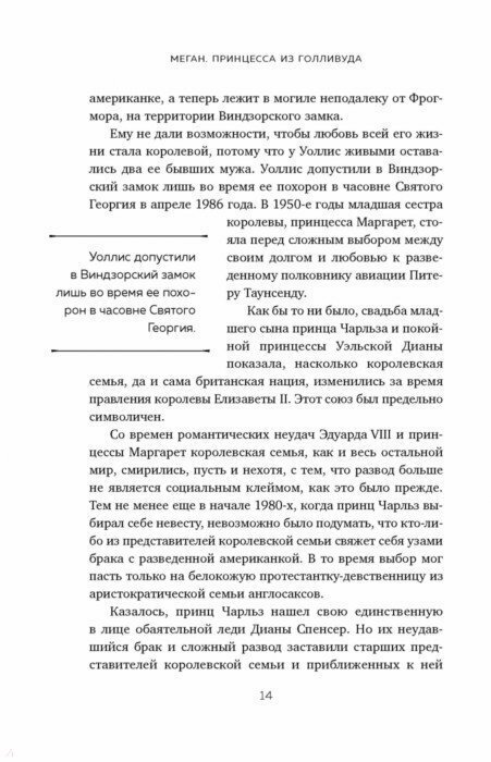 Эта книга - интереснейшее расследование. В ней собраны подробности из личной жизни Меган Маркл, рассказанные автору близкими друзьями, соседями и коллегами актрисы. Вы узнаете о юности Меган, ее первом браке, о свидании вслепую с принцем Гарри и их конфетно-букетном периоде, о предложении руки и сердца и знакомстве с королевой Елизаветой II. А также о том, как Букингемский дворец принял простолюдинку и чем ей пришлось пожертвовать ради королевской семьи.