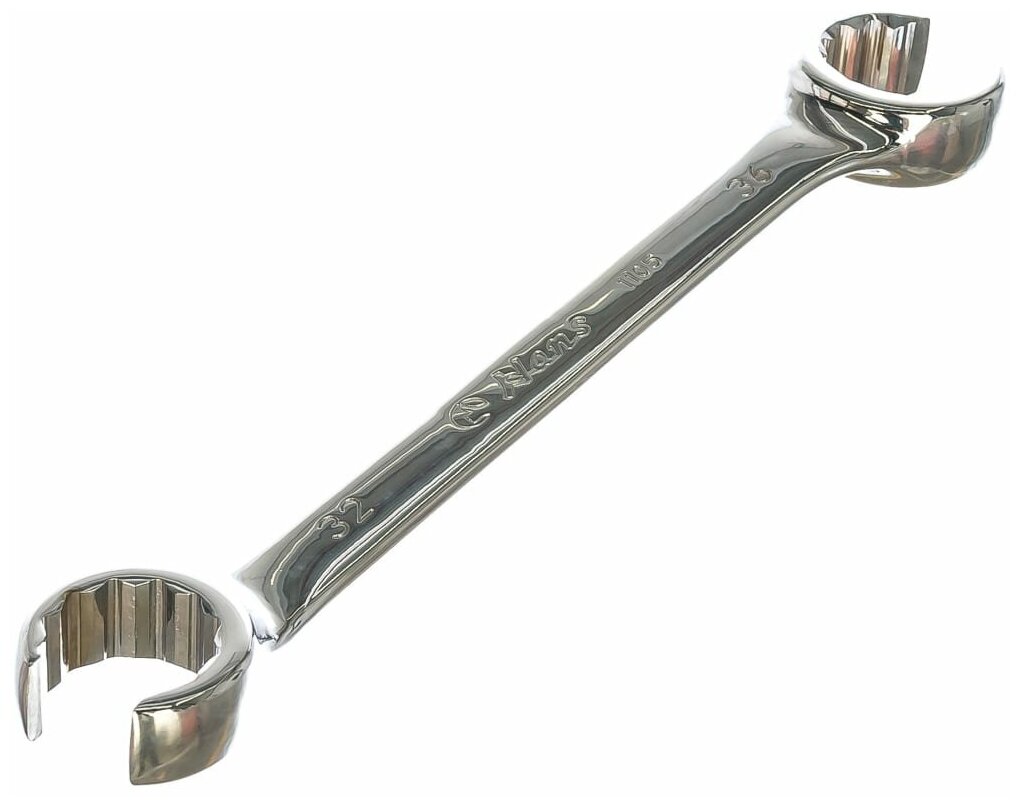 Разрезной ключ является специальной разновидностью ключей накидного типа и представляет собой конструкцию, состоящую из двух накидных профилей самых популярных или соседних размеров, имеющих специальный разрез. В первую очередь они необходимы для работы с гайками, трубопроводом пневматических и гидравлических магистралей, на которые невозможно надеть неразрезной накидной профиль. Из-за особенностей гаек такого типа применение рожкового профиля нежелательно, так как затяжка и отворачивание соединительной резьбы требует настолько большого усилия, что классический рожковый профиль может повредить крепеж. Благодаря применению хромванадиевой стали марки 6140, правильно проведенной закалке и увеличенной высоте профиля ключ способен выдерживать высокий крутящий момент. Ключ изготовлен по стандарту DIN, имеет трехслойное хромоникелевое покрытие, обеспечивающее повышенную стойкость к коррозии.