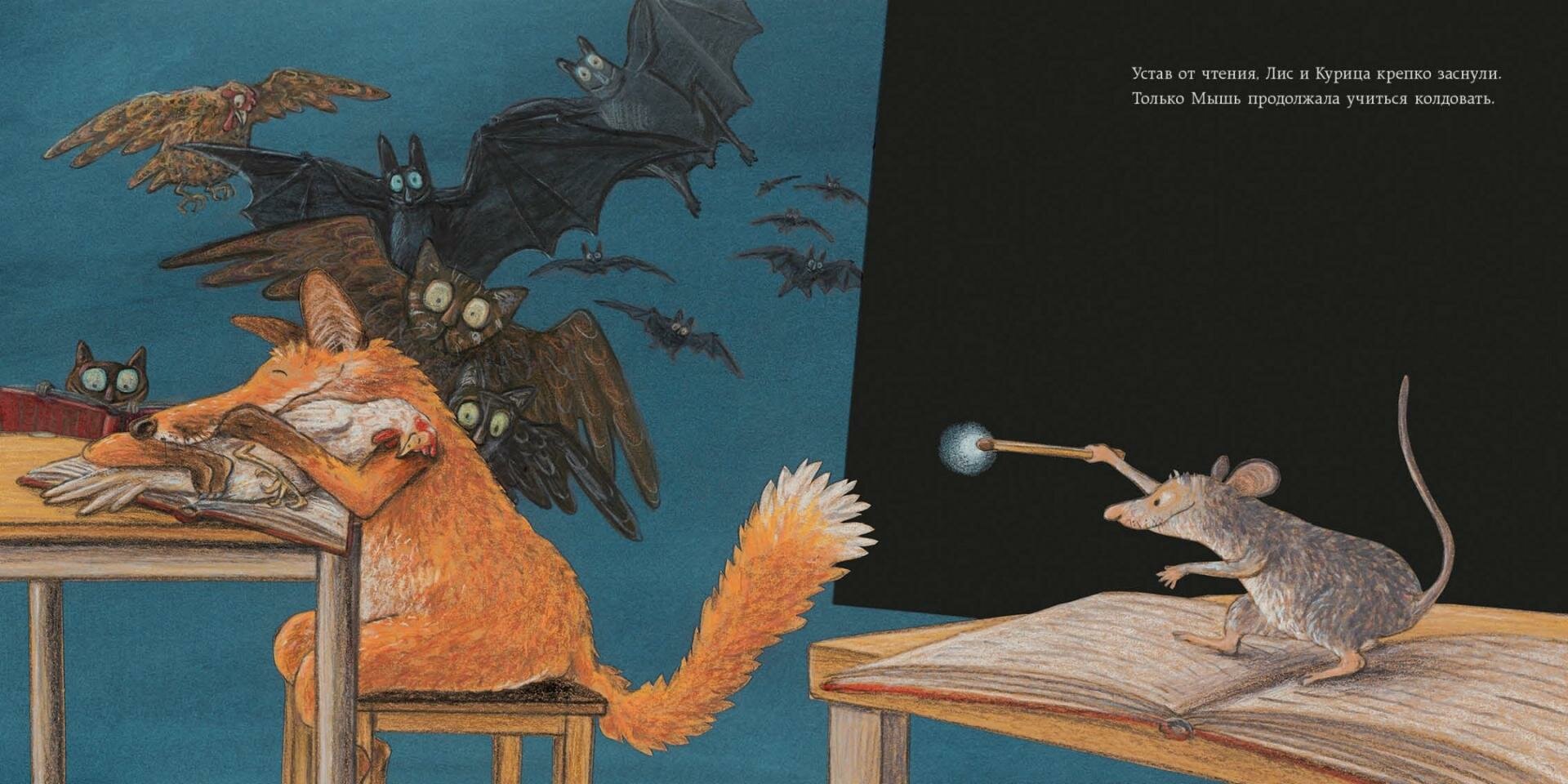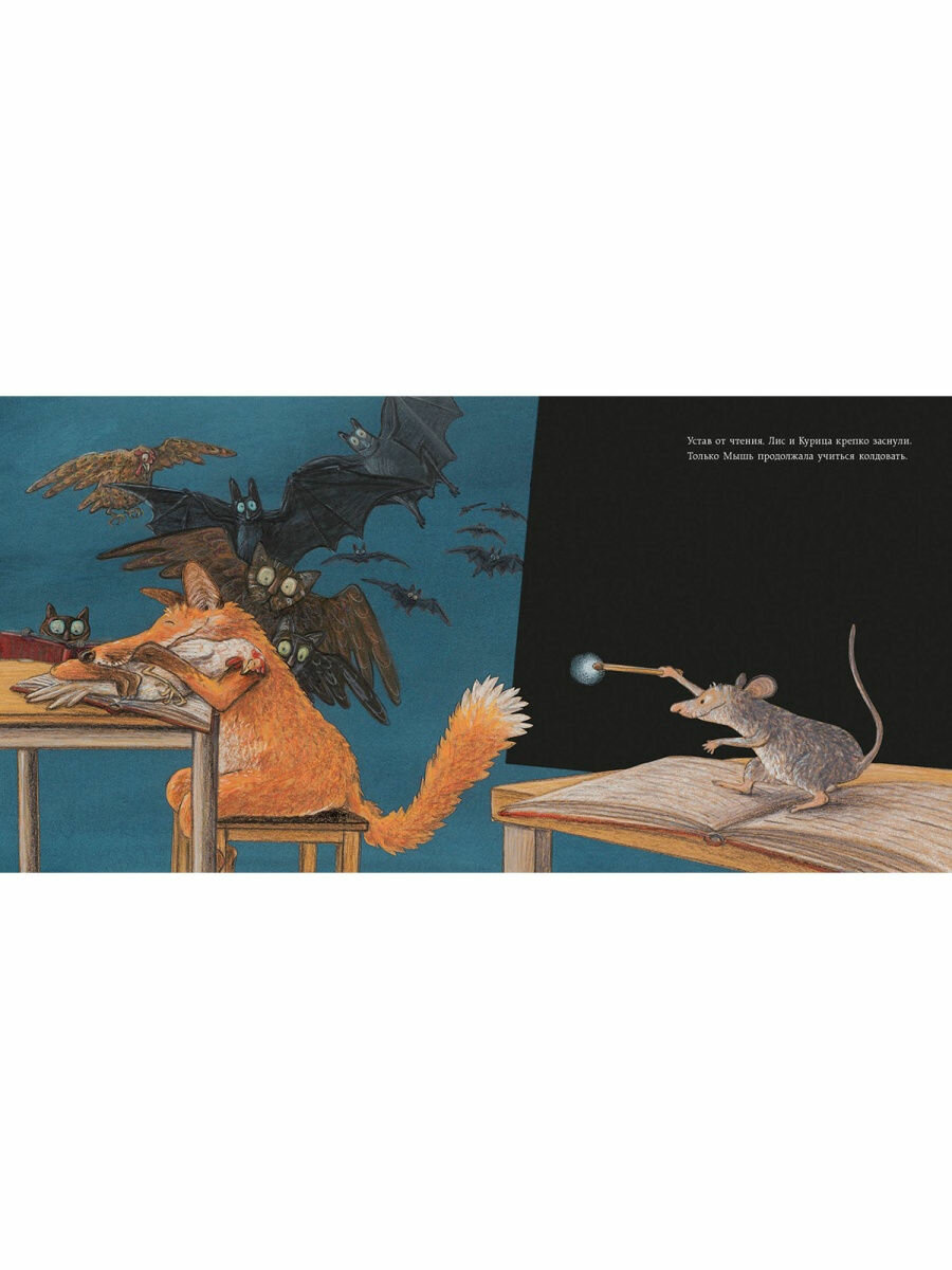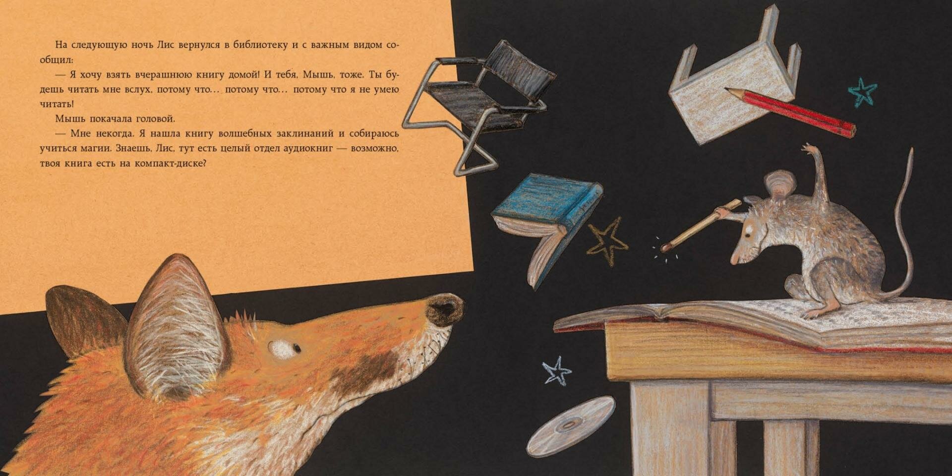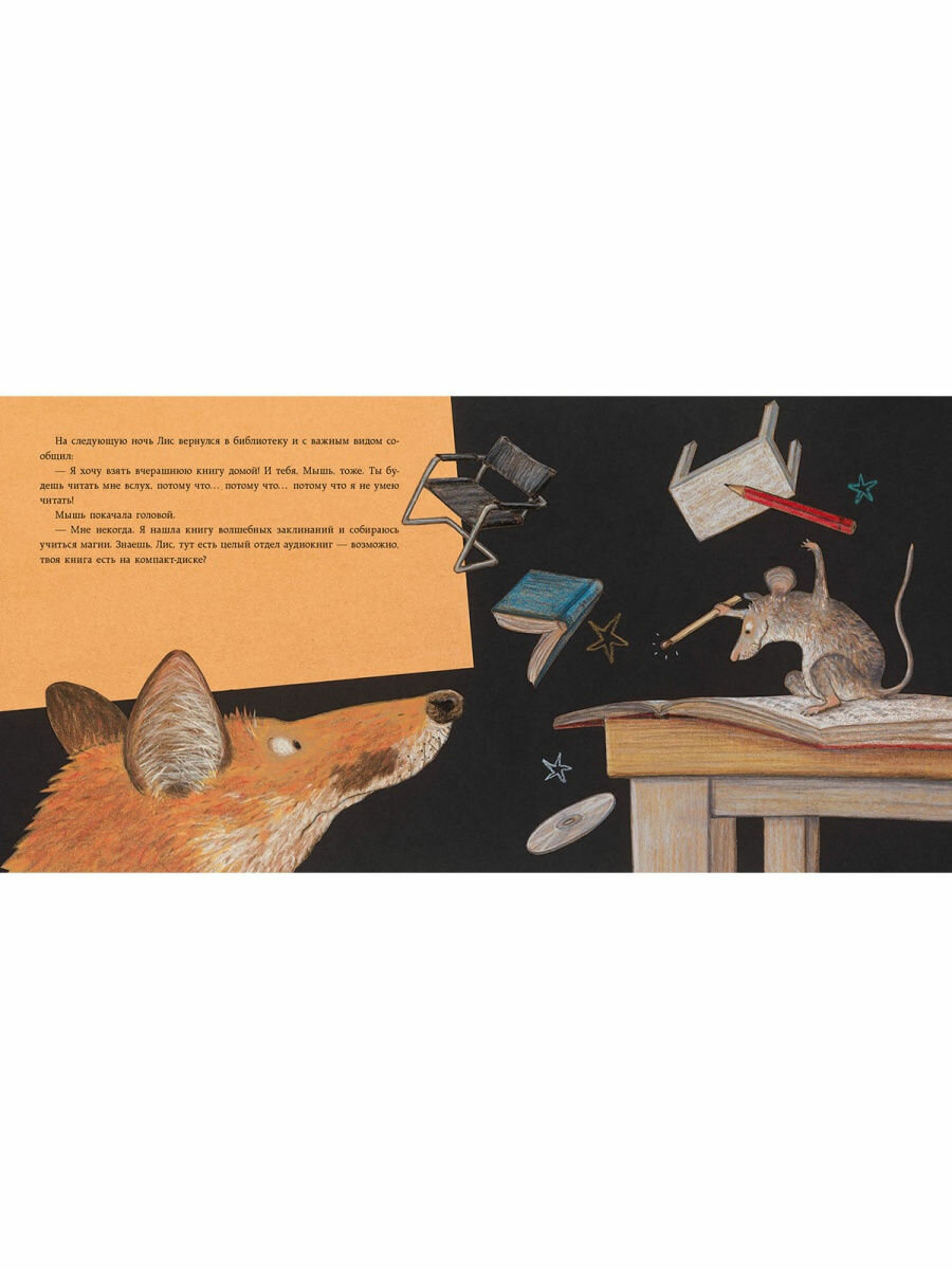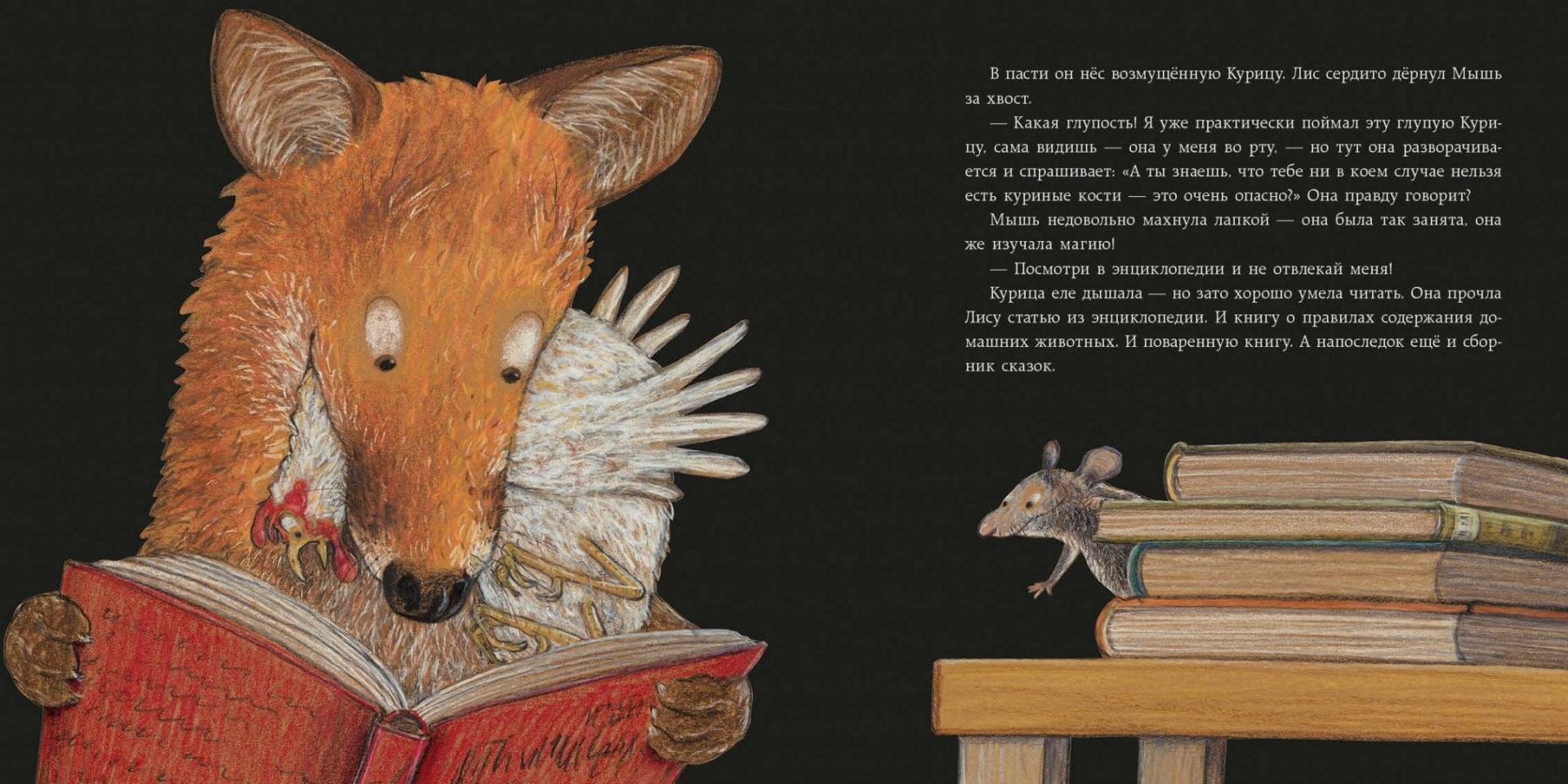 У меня единственное замечание по этой книге – в ней упоминаются аудиокассеты и компакт-диски, а наши дети знать не знают, что это такое. Но это мелочь, конечно. Сама по себе книга великолепная же! Очень небанальная сказка о пользе чтения. Курица умеет читать, мышь и вовсе волшебница и ночной библиотекарь. А лис – не умеет. Но это не беда, если суметь договориться – то и этот навык будет по силам. Забавные рисунки – и у лиса, и у мышки, даже у курицы рожицы не человеческие, но ухмылки очень даже! Надо умудриться так нарисовать – браво художнику.