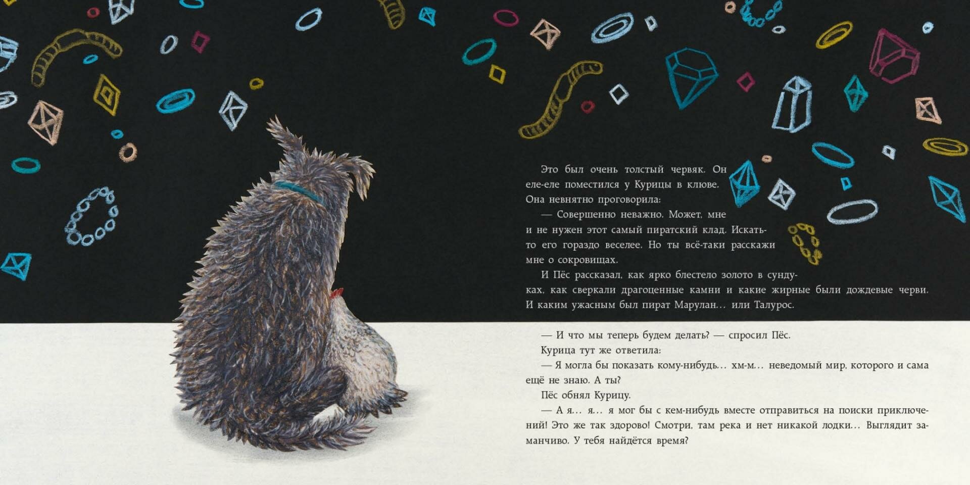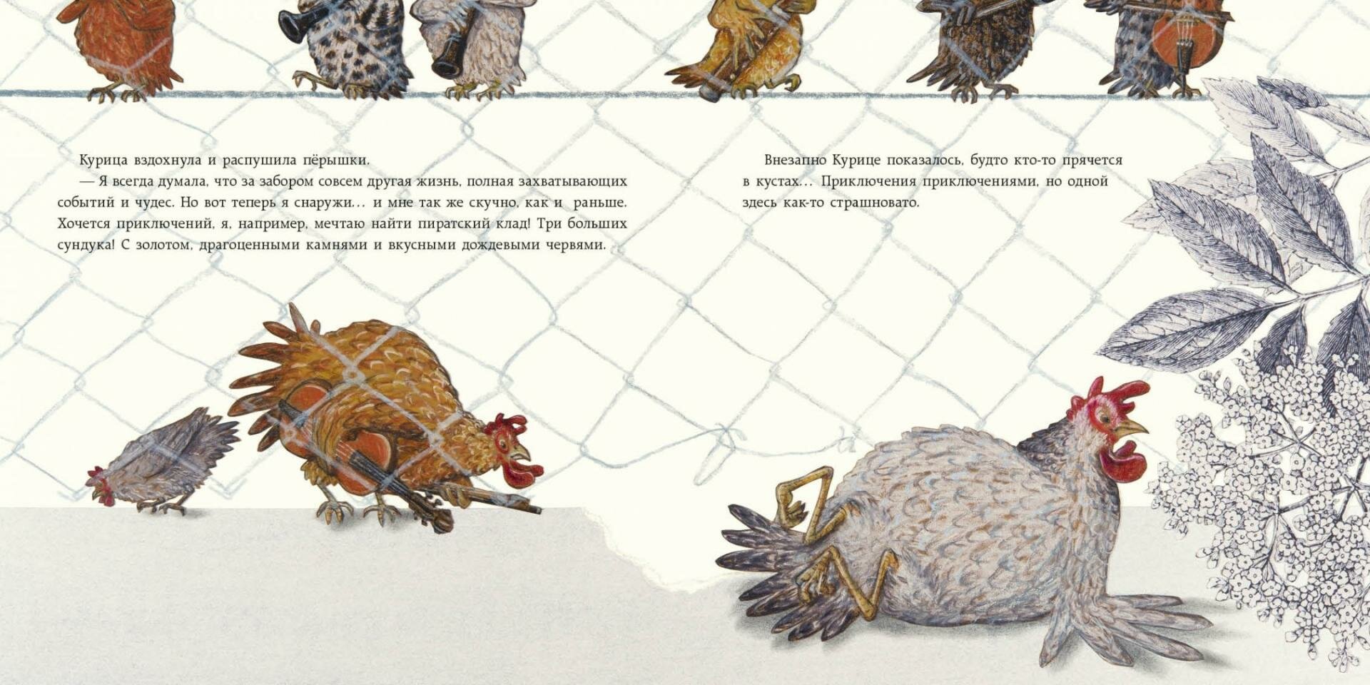На самом деле большая радость дожить до времени, когда родителям интересно читать детские книжки, потому что 20-30-40 лет назад их ещё не было таких. Я никак не умаляю заслуги старых изданий, но почему не радоваться новым? Вот эта, про дружбу курицы и пса? Во-первых, она красивая – я без доли иронии. Очаровательные иллюстрации, без капли безвкусицы, очень детальные и вполне ироничные. Во-вторых, уже нетривиально - курица, которая хочет стать пиратом. Ну здорово же! Даже если вынести за скобки более глубокий смысл, который несет любая поучительная история, сама по себе эта сказка классная и не так проста, как могло бы показаться на первый взгляд.
