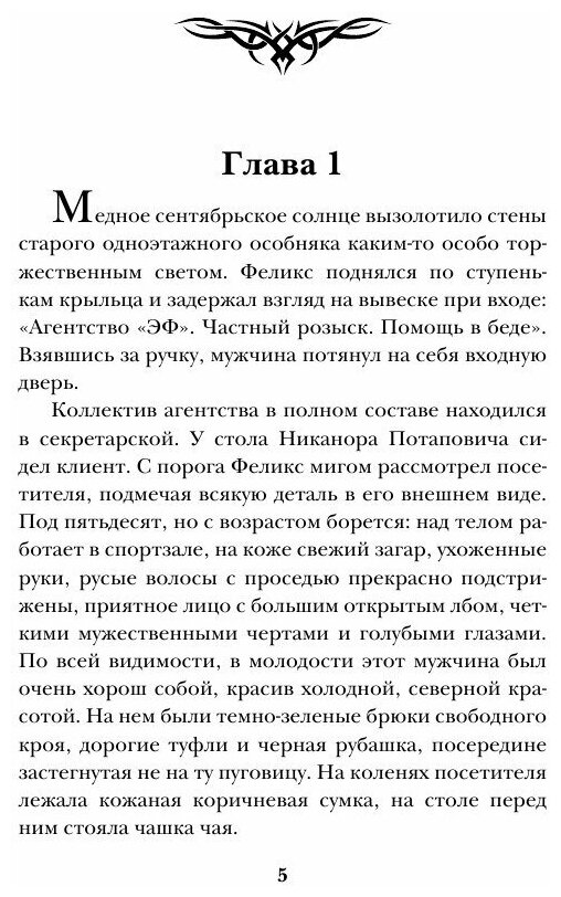 Третья книга о детективном агентстве «ЭФ» не обманула моих ожиданий! Хорошо задумана и полностью раскрыта детективно-мистическая составляющая, больше уделено внимания коллективу агентства. Понравилось описание Греции, право, захотелось там поселиться. Феликс нравится всё больше, он хотя и вампир, но такой человечный! Только не совсем поняла зачем было упоминание несколько раз бывшего владельца особняка, ведь это не имело никакого отношения к действию? Но, возможно, это для завязки следующей истории? Буду ждать. Жаль, что нет отзывов других читателей, я что одна читаю?