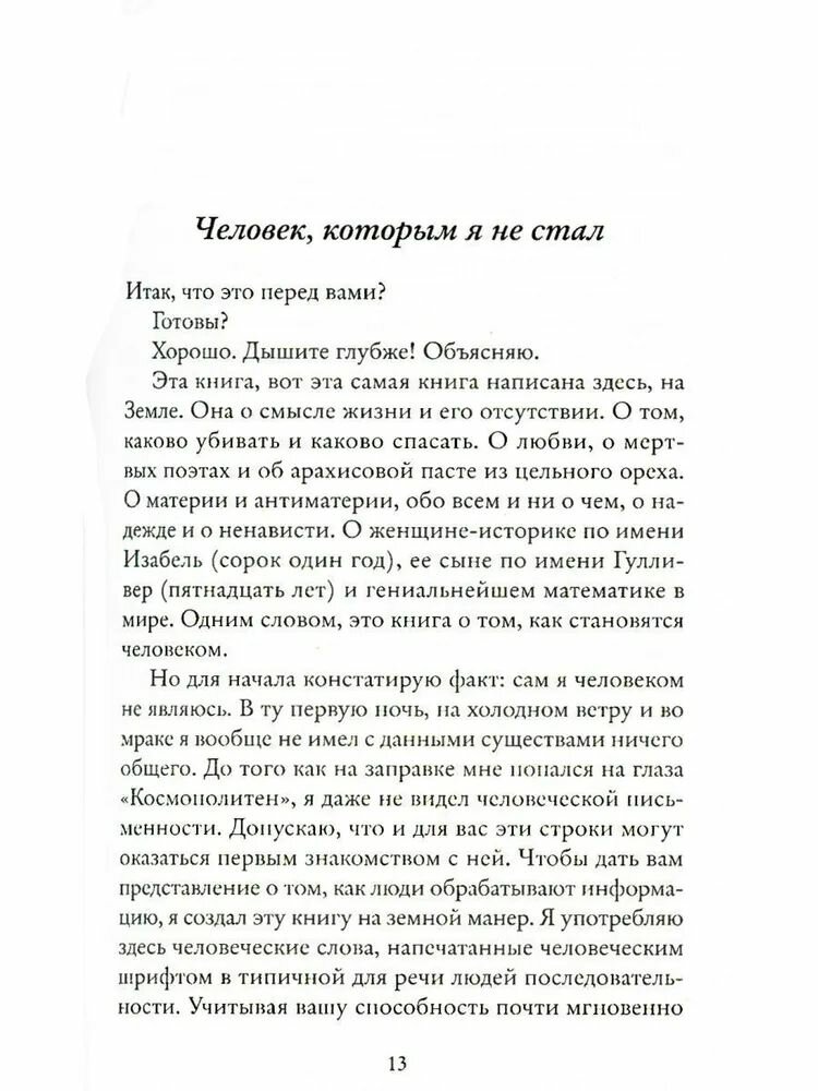 Да уж, первое знакомство с представителями человеческой расы проходит не слишком гладко. А ведь герою предстоит важнейшая миссия-уничтожить все следы доказательства решения одной из самых в мире задач, с которой каким-то чудом удалось справиться некому профессору Мартину. Ко всему, ни в коем случае, находясь в теле этого самого профессора, придется не выдать свою истинную сущность и выучиться, как же жить среди этих странных созданий, ведь быть человеком само по себе достаточно, чтобы сойти с ума.