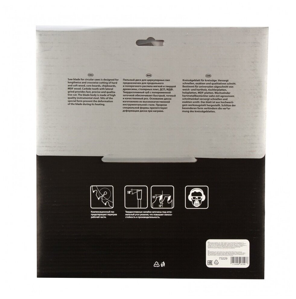 Пильный диск MATRIX Professional произведен с помощью специальная схемы заточки твердосплавных зубьев (ВК4), что позволяет производить качественную распиловку древесины. Компенсационные прорези уменьшают колебания, подавляют шумы и препятствуют изгибанию диска при нагреве.