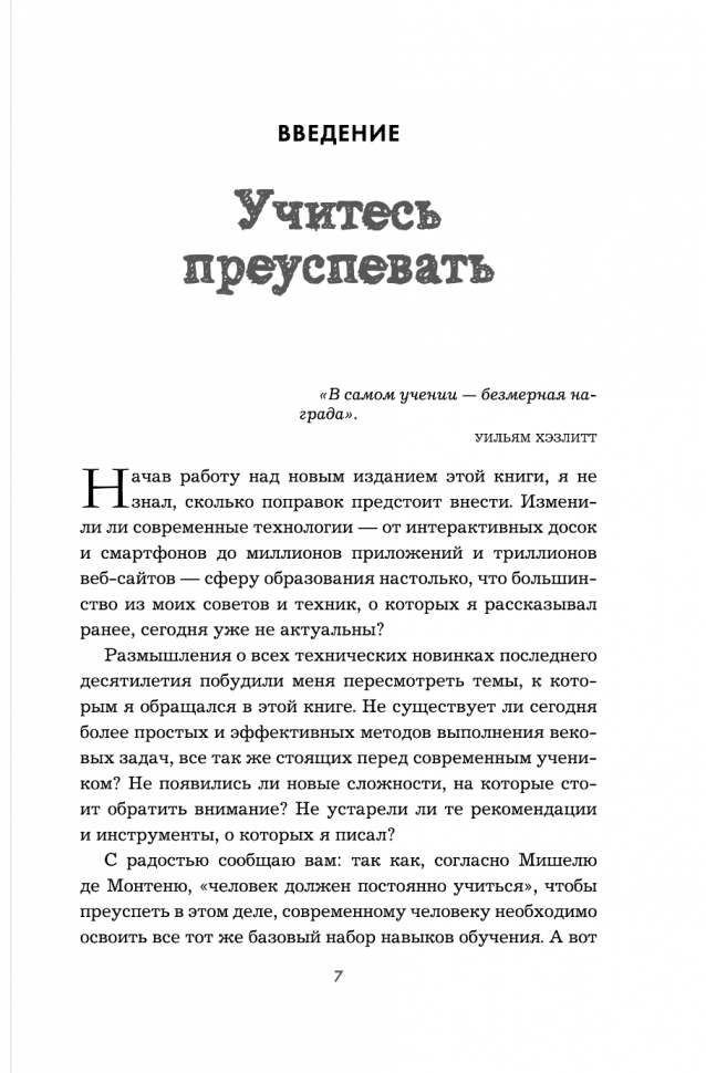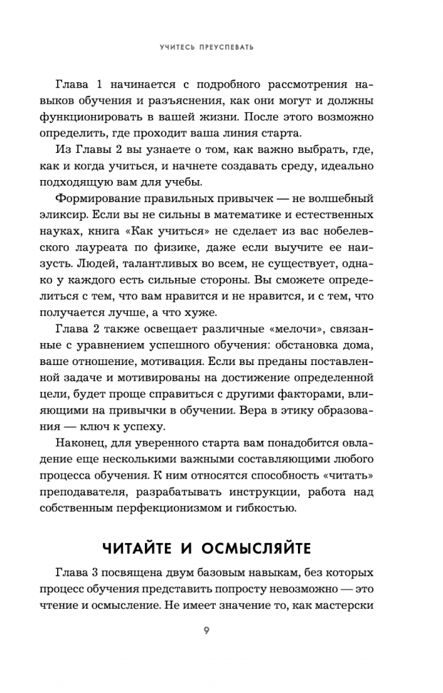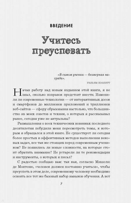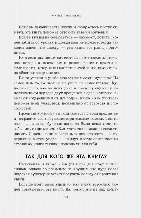 Хорошая попытка упорядочить систему навыков обучения. Книга довольно сбалансированая уделяется равное внимание разным аспектам процеса обучения, без перекосов. Но автор грешит банальностями «Заберите у ребенка телефон, пока не сделает задание», интересна реакция типичного подростка если у него попытатся забрать телефон). Вообщем твердое 4 никаких «супер-методик», а то что проверено временем.