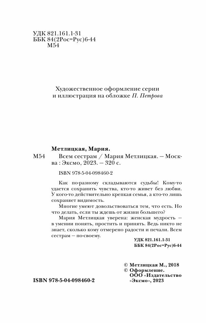 Книга: Всем сестрам (Метлицкая Мария Робертовна); ООО "Издательство "Эксмо", 2018