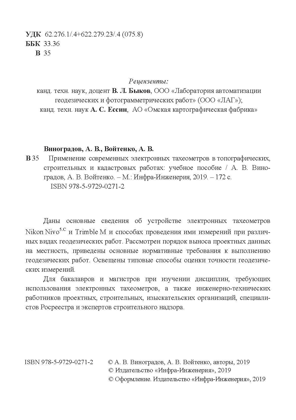 Применение современных электронных тахеометров в топографических строительных и кадастровых работах (Виноградов Аркадий Васильевич, Войтенко Андрей Владимирович); Инфра-Инженерия, 2018