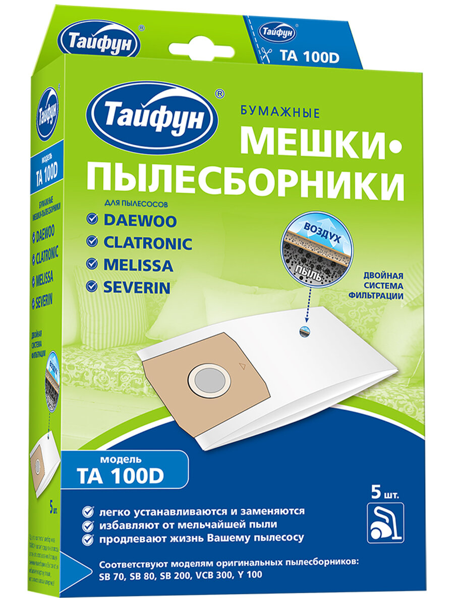 Для пылесосов Daewoo, Clatronic, Melissa, Severin. Изготовлены из бумаги на одном из лучших заводов Германии. Конструкция пылесборников учитывает требования производителей пылесосов, соответствует немецким стандартам качества. Одного комплекта пылесборников тайфун хватает в среднем на полгода активного использования. Используя сменные пылесборники, Вы полностью избавляете квартиру от пыли, неприятного запаха и аллергенов.
