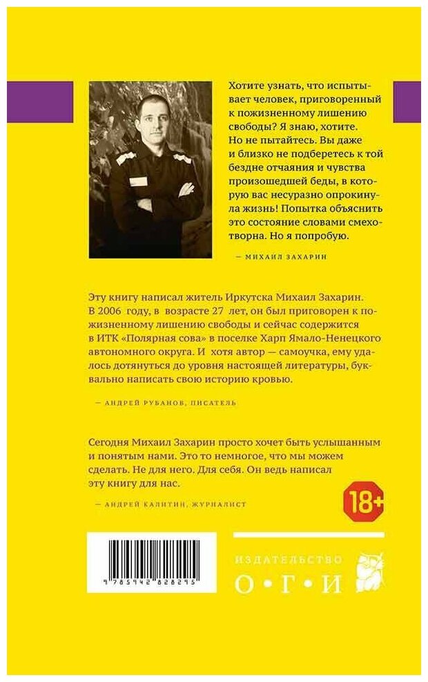 "Эту книгу написал житель Иркутска Михаил Захарин. В 2006 году, в возрасте 27 лет, он был приговорен к пожизненному лишению свободы и сейчас содержится в ИТК "Полярная сова" в поселке Харп Ямало-Ненецкого автономного округа. И хотя автор - самоучка, ему удалось дотянуться до уровня настоящей литературы, буквально написать свою историю кровью".