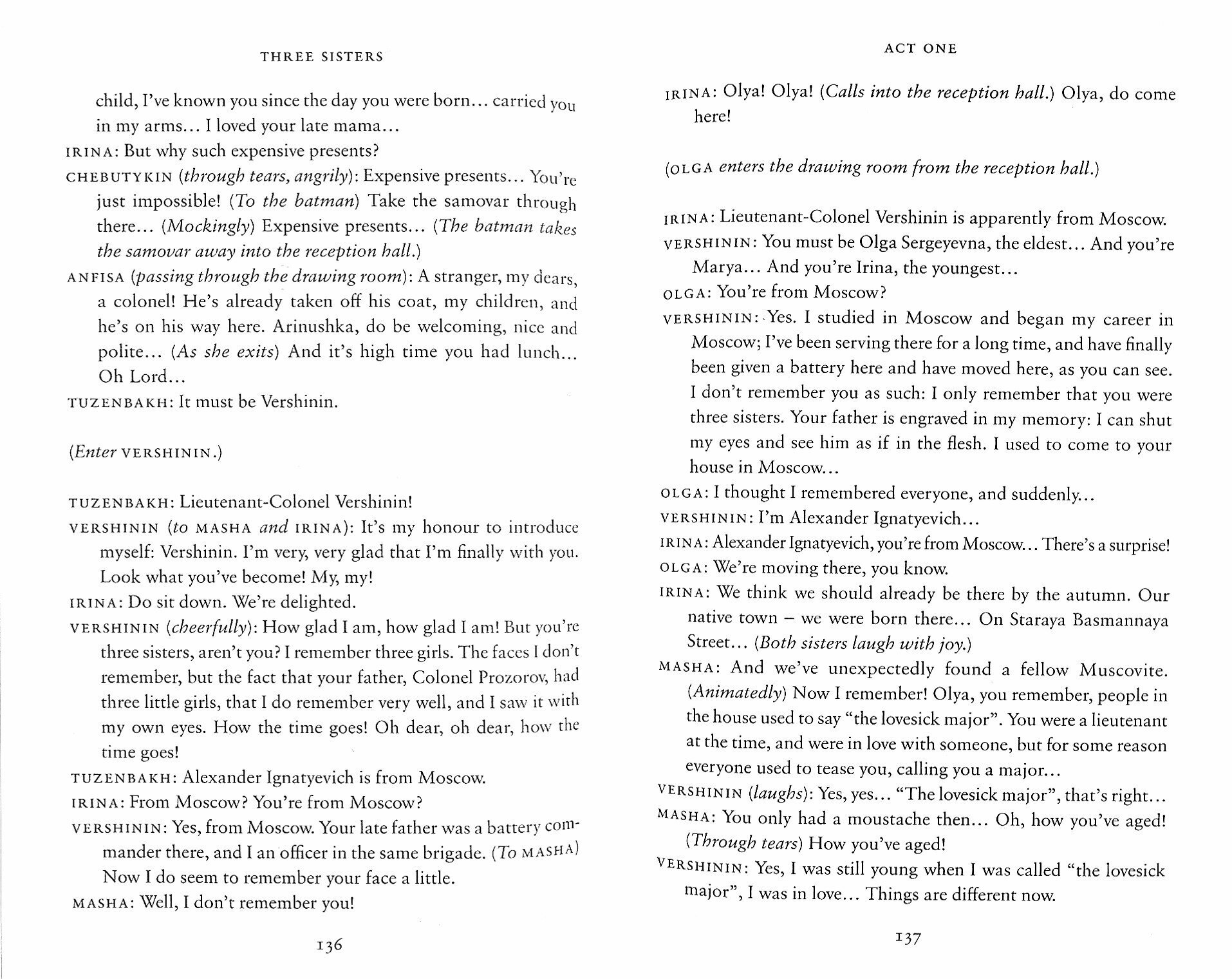 В этом издании есть хорошее, подробное введение, а также очень полезная информация о переводе. Как пишет Фрейн в примечании к переводу, знание русского языка и умение быть драматургом является преимуществом при переводе чеховских пьес. Читая на англ. языке пьесы впервые за много лет, ирония чувствуется очень сильно, но, возможно, это только одна из сильных сторон этого перевода, который, по крайней мере, на британском английском, звучит легко и естественно. Трудность перевода Чехова, которую Фрейн очень хорошо объясняет в своем примечании к переводу, связана с политикой имперской России, особенно с теми персонажами-студентами, которых выгнали или отправили за какие-то политические проступки.