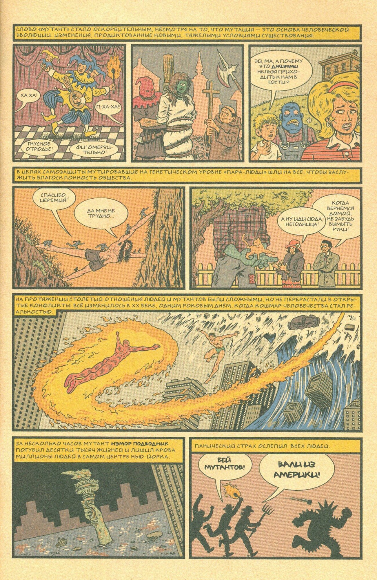 Люди-Икс.Великий замысел. Выпуск №1 - комикс, выполненный в стиле старых "сингловых" номерных выпусков: глянцевая обложка (очень тонкая, мнётся от любого прикосновения), плотные слегка шершавые листы с основным содержанием - в общем все те отличительные черты комиксов 80-х и 90-х годов. Сюжет крайне прост: наблюдатель рассказывает историю мутантов от нападения Немора (Подводника) на Нью-Йорк и далее.