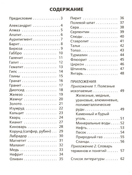 В издании описание следующих минералов: александрит, алмаз, апатит, аурипигмент, барит, бирюза, габбро, галенит, галит, гематит, гипс, глины, гранат, гранит, диопсид, железо, жемчуг, золото, изумруд, кальцит, кварц (горный хрусталь, аметист, цитрин, раухтопаз, волосатики, соколиный, тигровый глаз, яшма, кремень, халцедон, обсидиан, кварцит, кизельгур, опал), кианит, киноварь, корунд (сапфир, рубин), лабрадор, магнетит, малахит, медь, нефрит, оливин, пирит, полевой шпат, сера, серпентин, слюды, ставролит, тальк, топаз, турмалин, флюорит, циркон, шпинель, янтарь. -