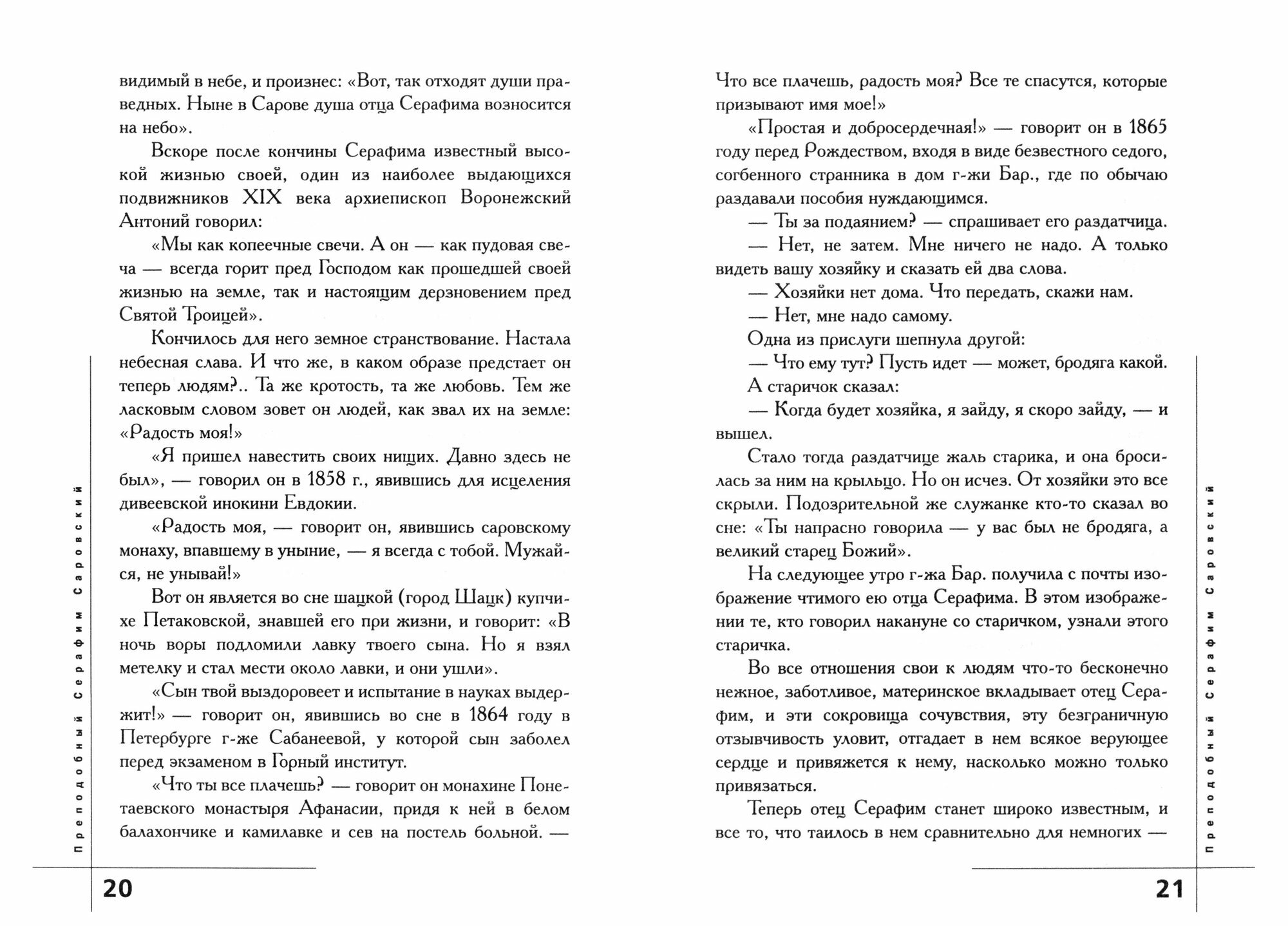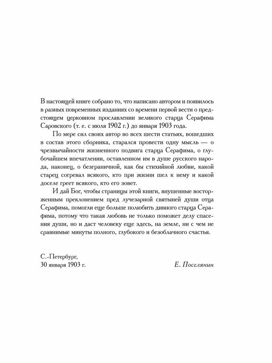 .Сборник статей о преподобном Серафиме Саровском впервые увидел свет в 1903 г. сразу после канонизации старца. Труд Евгения Поселянина основан на свидетельствах очевидцев, либо заставших в живых преподобного Серафима, либо лично знавших ближайших его учеников.