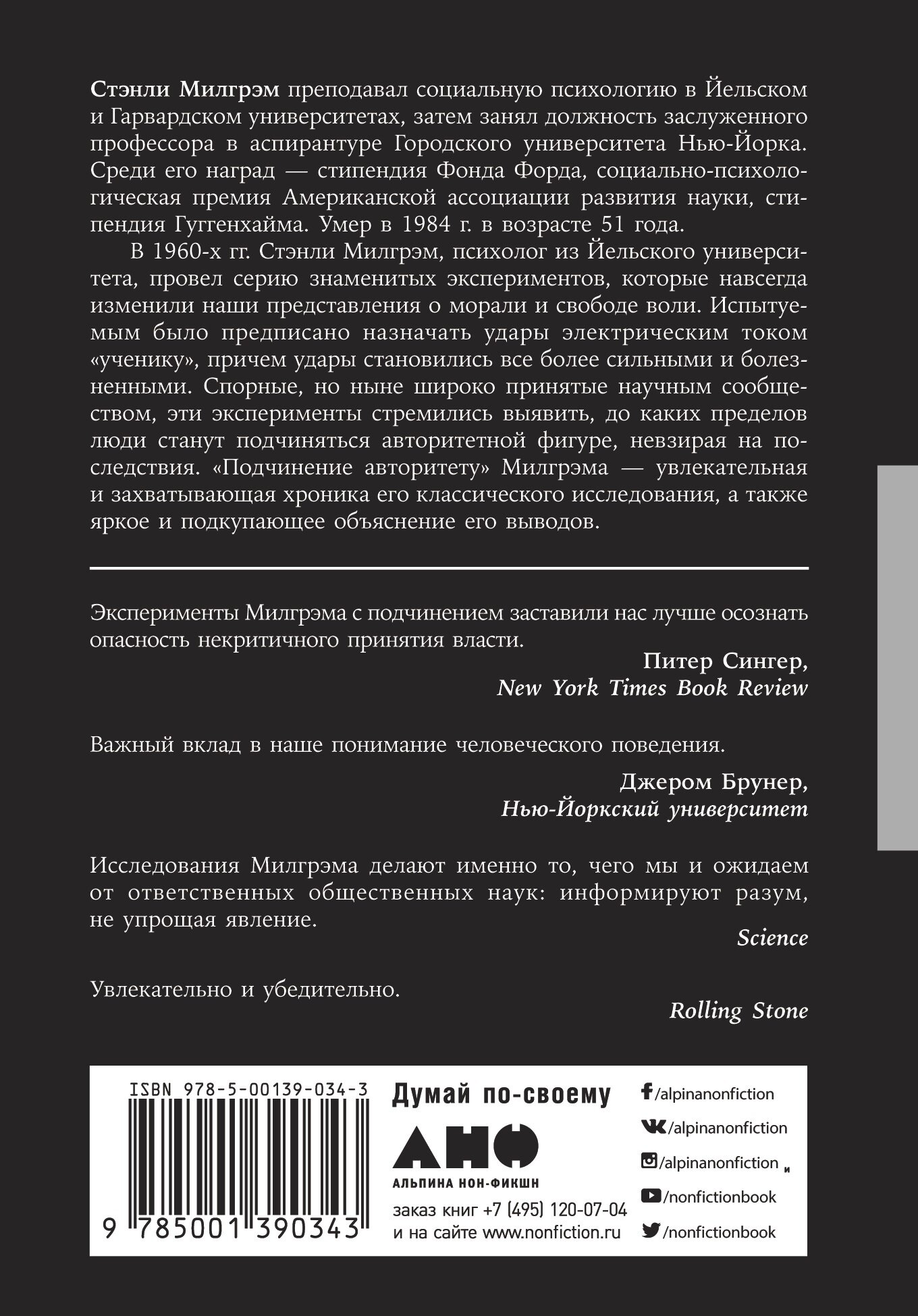 Подчинение авторитету: Научный взгляд на власть и мораль (Милгрэм Стэнли , Пискотина Роза (редактор), Ястребов Глеб Гарриевич (переводчик)); Альпина нон-фикшн, 2018