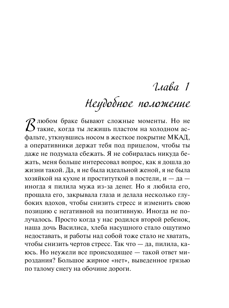 В любом браке бывают сложные моменты. Но не такие, когда ты лежишь пластом на холодном асфальте, уткнувшись носом в жесткое покрытие МКАДА, а оперативники держат тебя под прицелом. Я не собиралась никуда бежать, меня больше интересовал вопрос, как я дошла до жизни такой. Да, я не была идеальной женой, я не была хозяйкой на кухне и проституткой в постели, и - да - иногда я пилила мужа из-за денег. Но я любила его, прощала его. Почему же он сбежал с места задержания? Отчего машину обыскивают? Зачем Сергей оставил меня в этой ужасной ситуации?