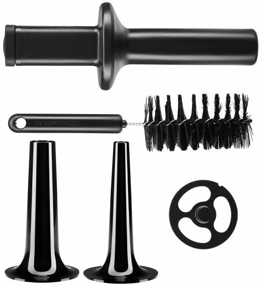 | Комплектация | корпус насадки-мясорубки, 2 насадки для наполнения колбасной оболочки (диаметр 19 и 9,5 мм), 3 решетки из нержавеющей стали с диаметром отверстий 8, 4.5 и 3 мм, нож из нержавеющей стали, набивочный диск, щетка для чистки, толкатель |