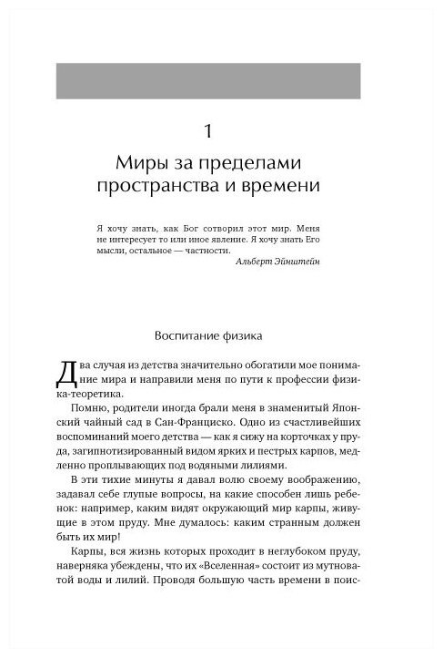 Интереснейшая книга о сложных физических теориях и открытиях. Вначале читается достаточно легко, но со 2 раздела уже приходится вчитываться, особенно когда описывается квантовая теория: даже примечания не обошлись без математического аппарата (хотя понять идеи несложно, хватит и знания 10-11 класса школы по физике и математике). При этом Митио Каку охватывает не только вопросы физики, но и их историю, связь с философией и религией, Приводится большое количество источников, рассматриваются взгляды многих ученых и прошлого, и современности.