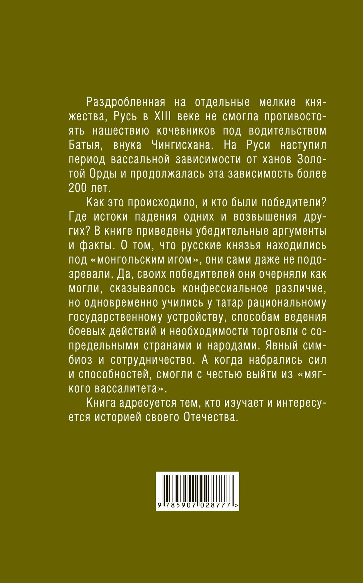 Раздробленная на отдельные мелкие княжества, Русь в XIII веке не смогла противостоять нашествию кочевников под водительством Батыя, внука Чингисхана. На Руси наступил период вассальной зависимости от ханов Золотой Орды и продолжалась эта зависимость более 200 лет. Как это происходило, и кто были победители? Где истоки падения одних и возвышения других? В книге приведены убедительные аргументы и факты. О том, что русские князья находились под "монгольским игом", они сами даже не подозревали. Да, своих победителей они очерняли как могли, сказывалось конфессиальное различие, но одновременно учились у татар рациональному государственному устройству, способам ведения боевых действий и необходимости торговли с сопредельными странами и народами. Явный симбиоз и сотрудничество. А когда набрались сил и способностей, смогли с честью выйти из "мягкого вассалитета". Книга адресуется тем, кто изучает и интересуется историей своего Отечества.