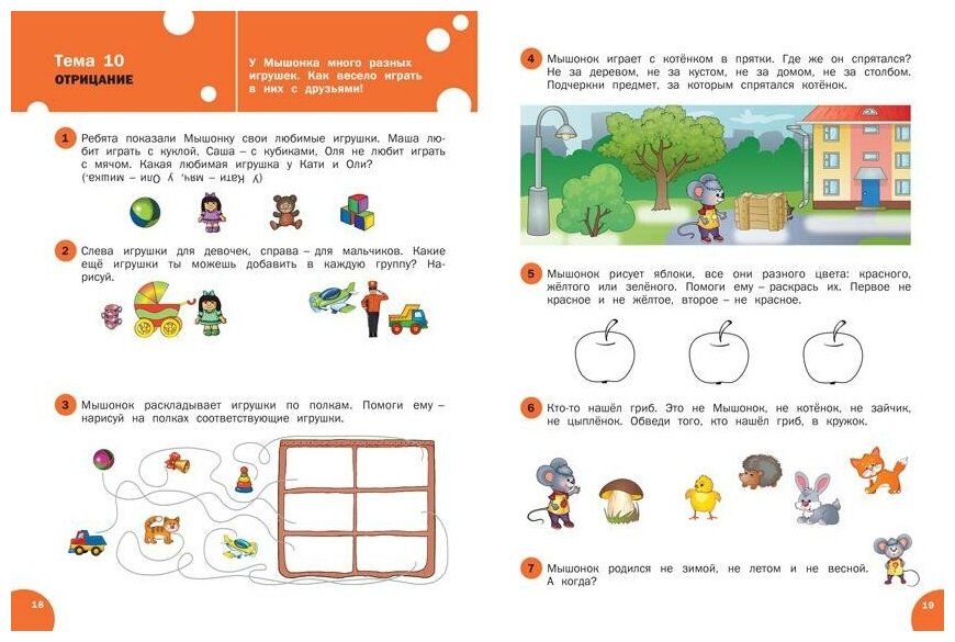 Отличная книга Е.А. Ульевой "Логика" от издательства "Вакоша" является тетрадью для занятий с детьми 5-7 лет. Издание включает в себя 34 темы. Каждая тема расположена на одной или двух страницах, соответственно количество заданий в каждой теме тоже разное. Например, тема "Свойства: цвет" включает 3 задания, а "Синтез " отражен в двух темах в 12 заданиях. В конце тетради две темы отведено для повторения и закрепления материала. Каждая тема выделена своим цветом. На протяжении всей книги детей будет сопровождать Мышонок, с ним путешествовать в стране Логика станет ещё интересней. Книга чуть меньше формата А4, обложка плотная глянцевая, страницы белые с яркими иллюстрациями.