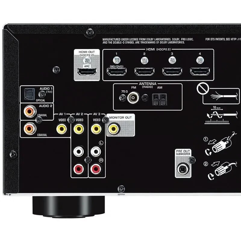 | Входы | 4 HDMI входов HDMI (2.0) с поддержкой 4K/60 Гц, HDCP 2.2, HDR, Dolby Vision, 4 композитных, 3 линейных (RCA + mini-jack 3,5 мм на передней панели), 2 коаксиальных, оптический, USB-порт |