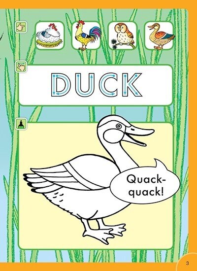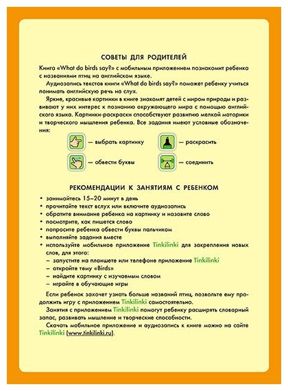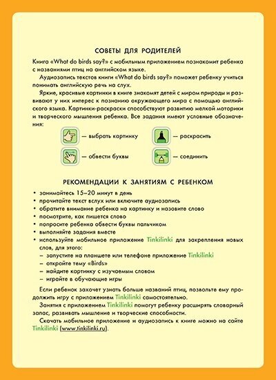 Купила книгу для дочки 5л в дополнение к занятиям по английскому языку. Книга формата А4, печать хорошего качества, картинки приятные. В книге представлены 10 птиц и простейшие предложения про них (кто что говорит). На каждом развороте представлен материал про одну птицу, предлагается ребенку раскрасить картинку. Страницы мелованные, из-за этого раскрашивать неудобно. В книге птицы "говорят" непривычно для русского слуха. В конце книги есть задание на повторение - соединить названия птиц и кто что говорит.