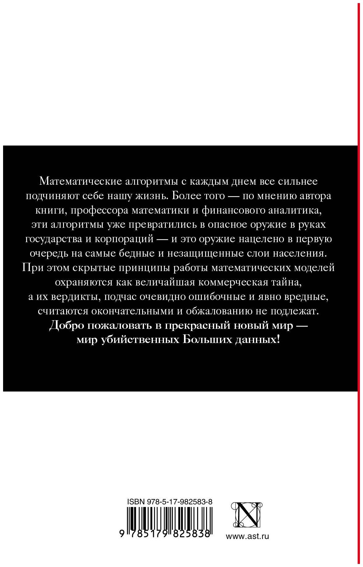 Математические алгоритмы с каждым днем все сильнее подчиняют себе нашу жизнь. Более того - по мнению автора книги, профессора математики и финансового аналитика, эти алгоритмы уже превратились в опасное оружие в руках государства и корпораций - и это оружие нацелено в первую очередь на самые бедные и незащищенные слои населения. При этом скрытые принципы работы математических моделей охраняются как величайшая коммерческая тайна, а их вердикты, подчас очевидно ошибочные и явно вредные, считаются окончательными и обжалованию не подлежат.