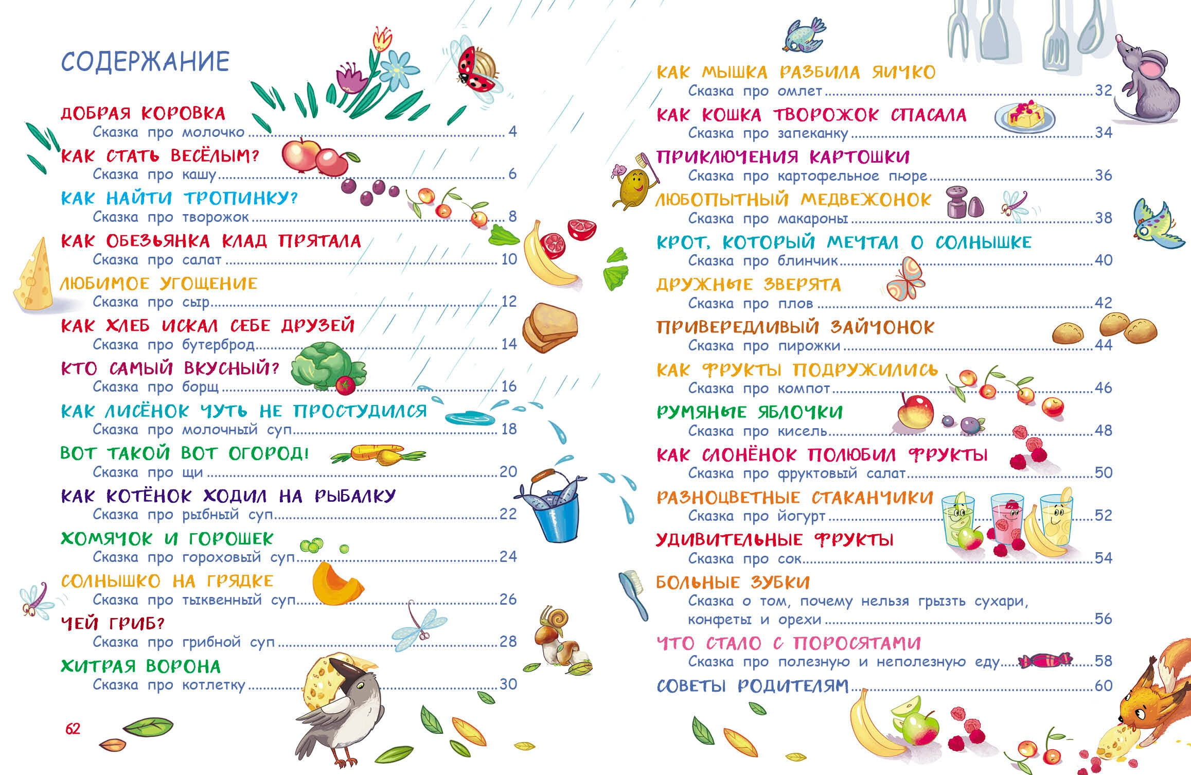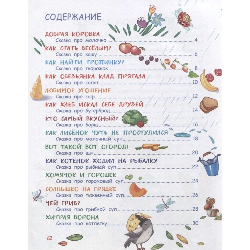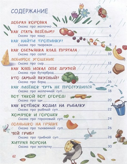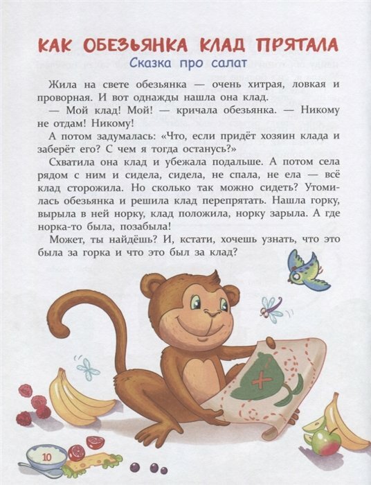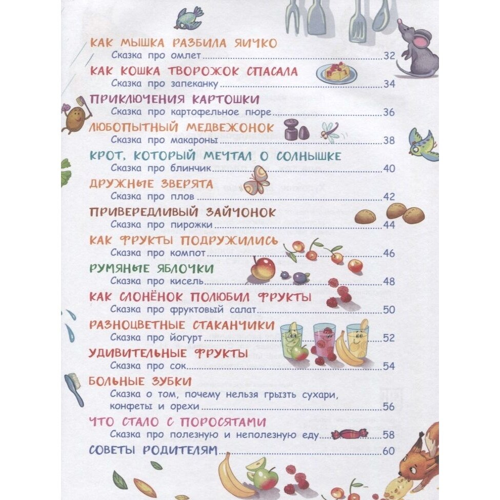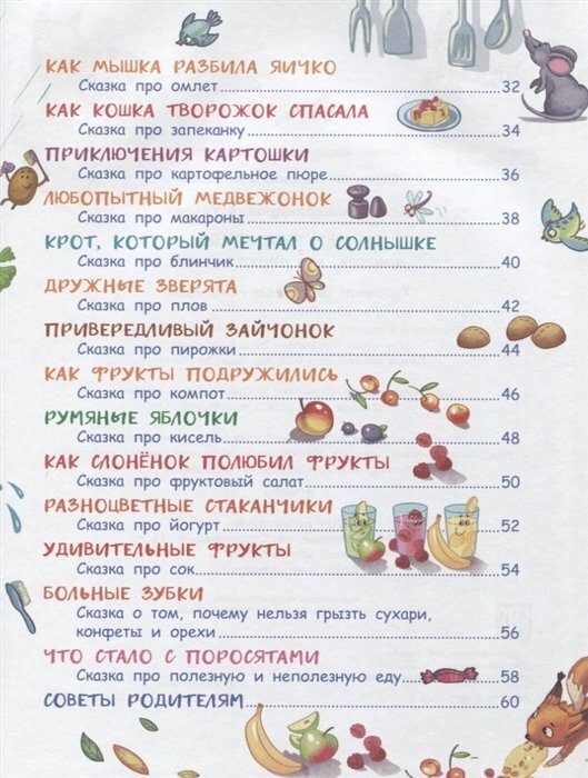 Очень интересная книжка, интересные сказки и красивые иллюстрации. Книжка рассчитана на чтение детям до 3х лет (так указано в книге), но я брала дочке 7 лет для самостоятельного чтения, и ей очень понравились вкусные сказки и веселые картинки овощей, фруктов и еды.