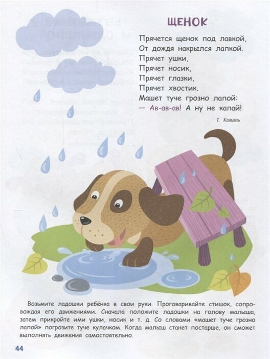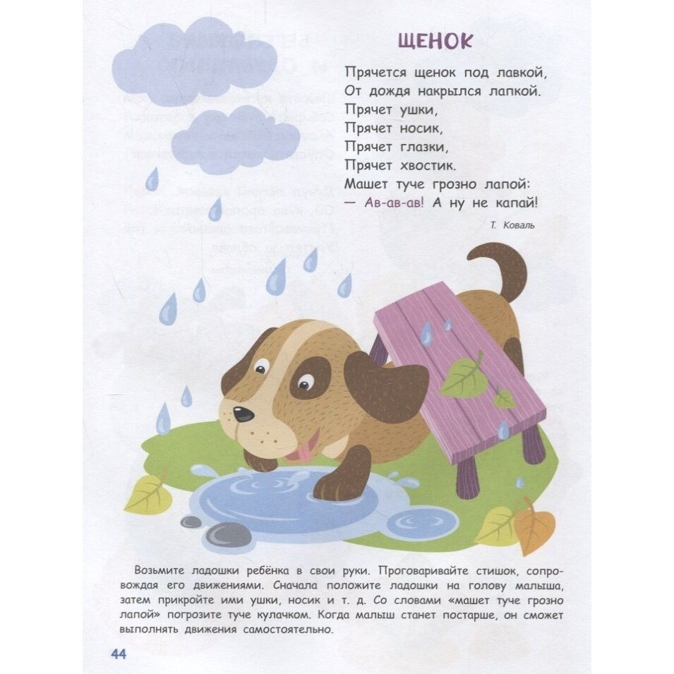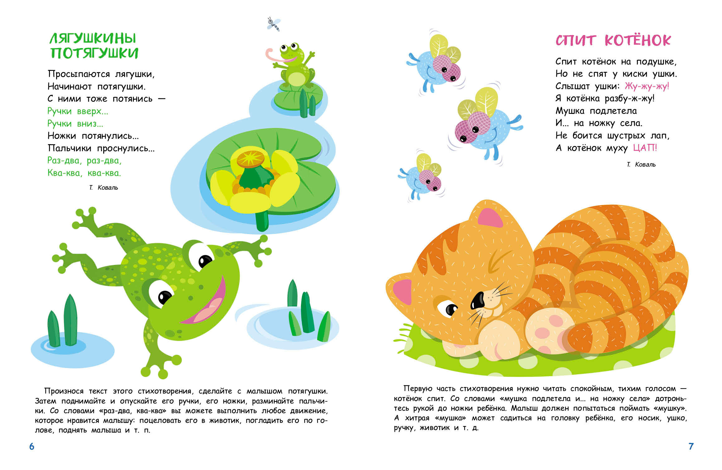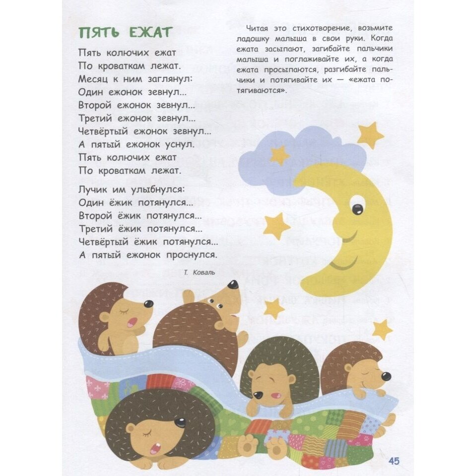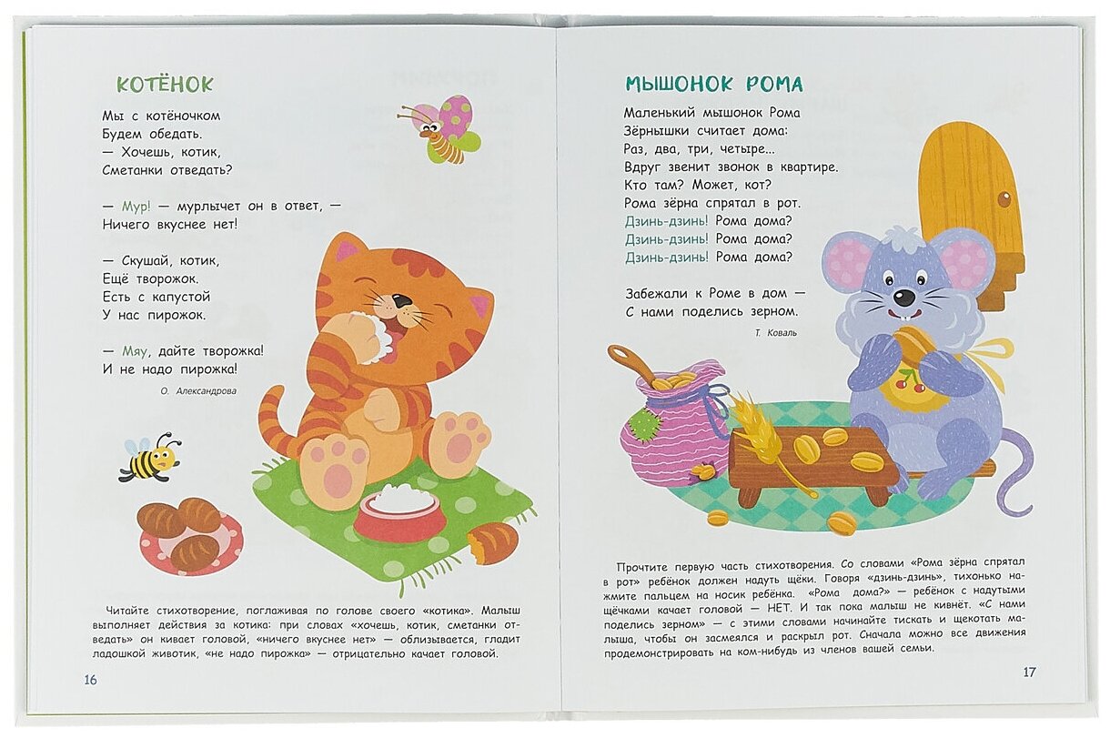 Купила книжку чтобы занять ребёнка когда нужна усидчивость и не пожалела! Очень классная книжка: на каждой странице написан стишок и ниже комментарий как играть с ребёнком и на что делать акцент. Картинки в книжке радуют глаз, красивые и добрые! Нам очень нравятся. Кстати, стишки легко запоминаются не сложно их выучить) спасибо Лабиринту и издательству «Стрекоза»!