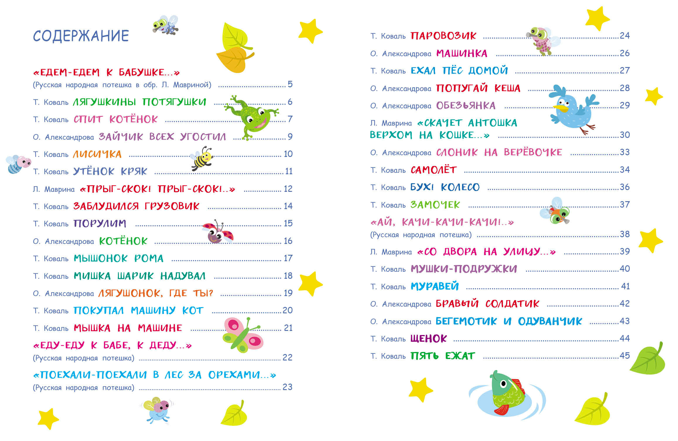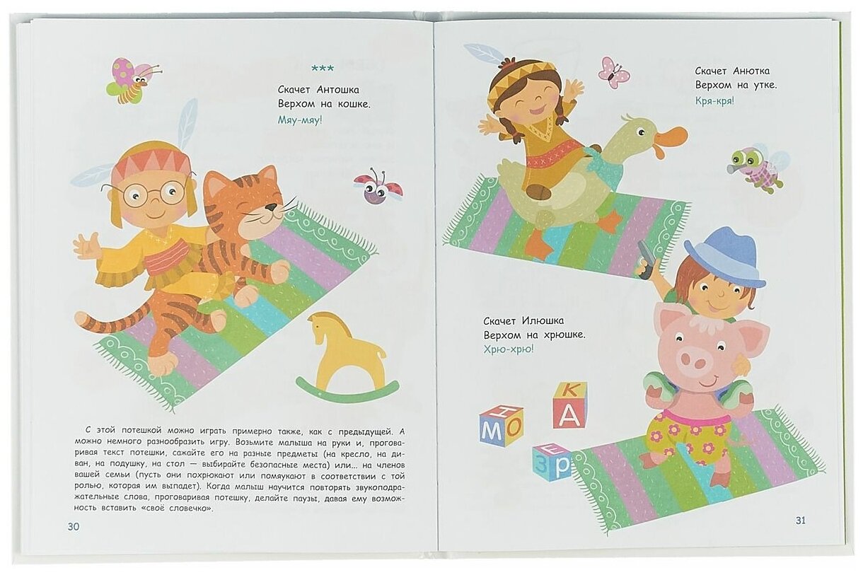 Со временем ребёнок запомнит движения и будет стараться принять в игре более активное участие. Постепенно он также запомнит отдельные слова и начнёт повторять их за вами. Когда малыш станет чуть старше, вы сможете с ним рассмотреть и обсудить картинки в этой книжке, а также выучить наизусть весёлые потешки.
