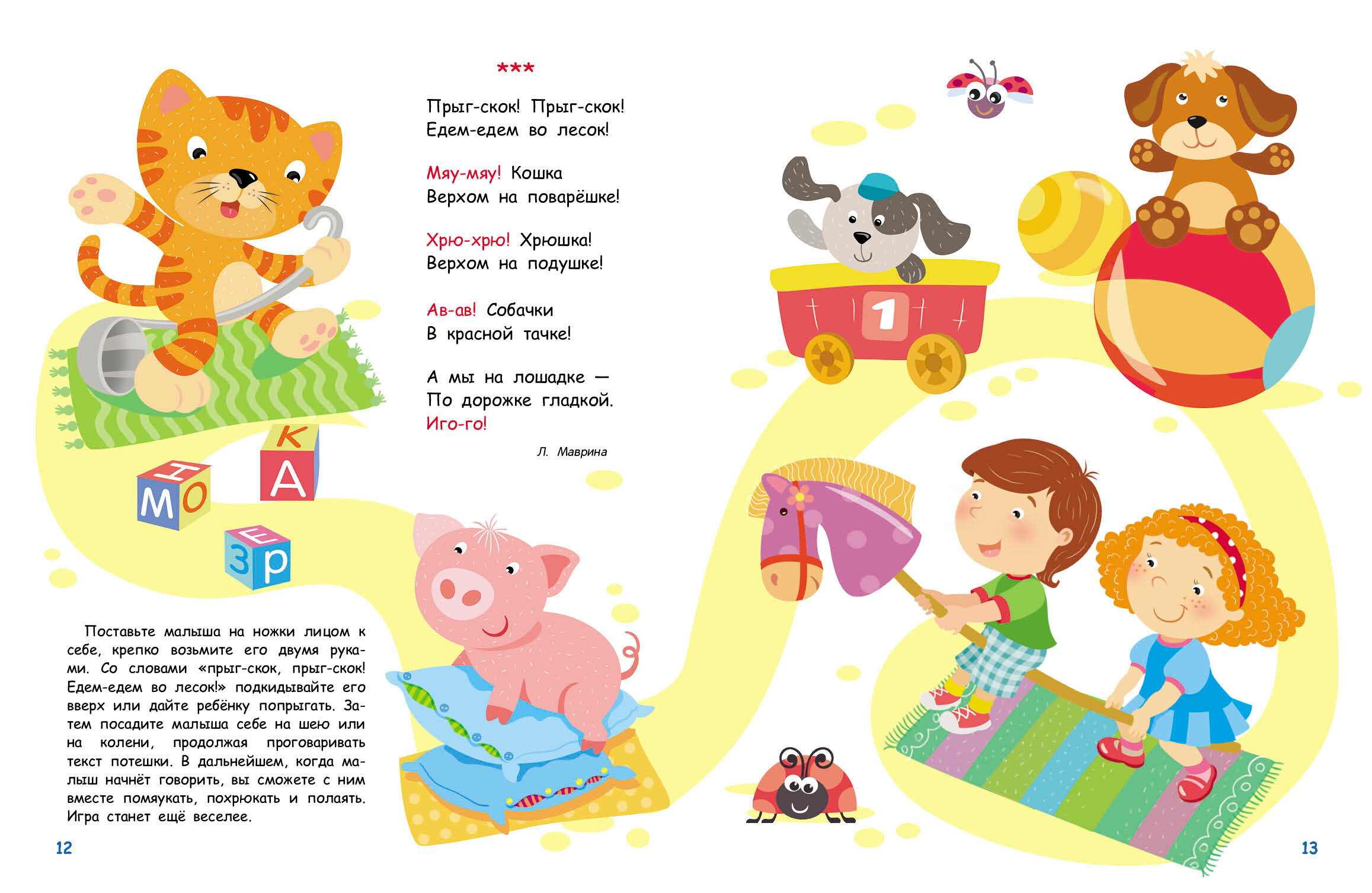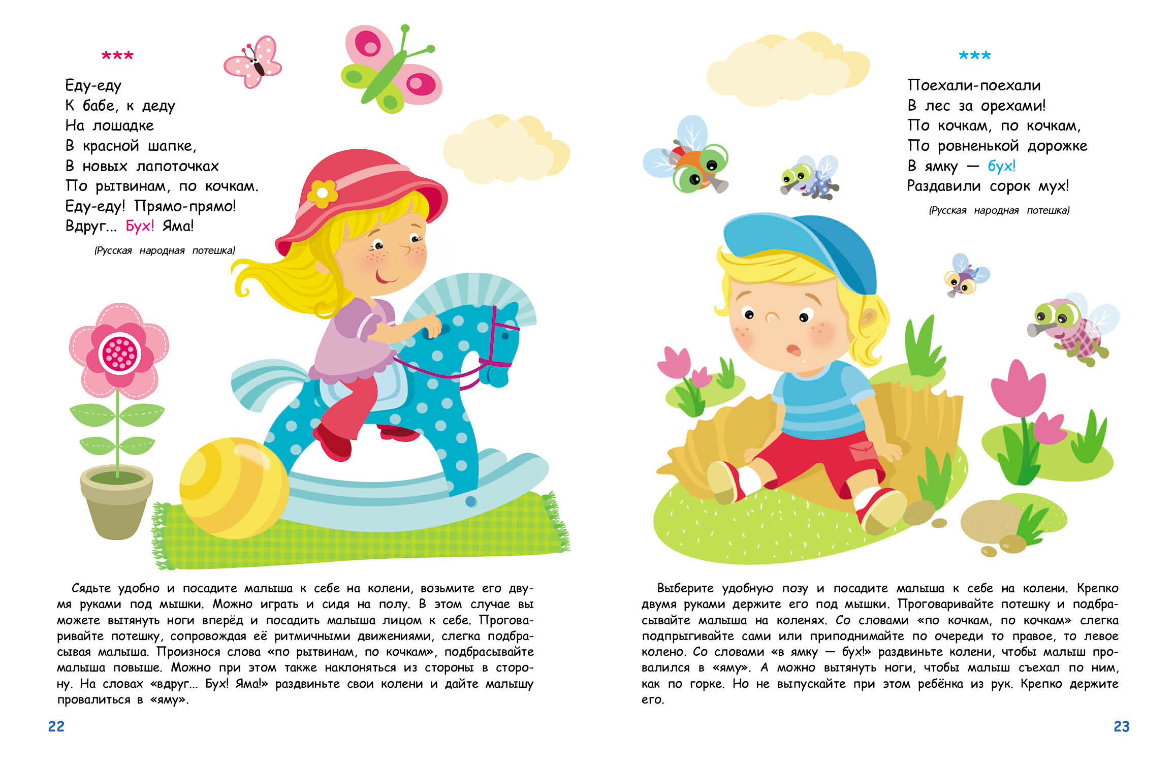 В этой книжке мы собрали стихи и потешки для игр с малышом на коленках. Проговаривайте их во время игр громко и чётко, сопровождая движениями, соответствующими темпу и ритму вашей речи. Помните о безопасности, всегда внимательно следите за малышом и подстраховывайте его. Избегайте резких движений. Ни в коем случае не продолжайте игру, если малышу она не нравится. Следите, чтобы ребёнок не устал чрезмерно. Завершая игру, обнимите малыша и слегка успокойте его. Погладьте по голове и поцелуйте, чтобы снять перевозбуждение.