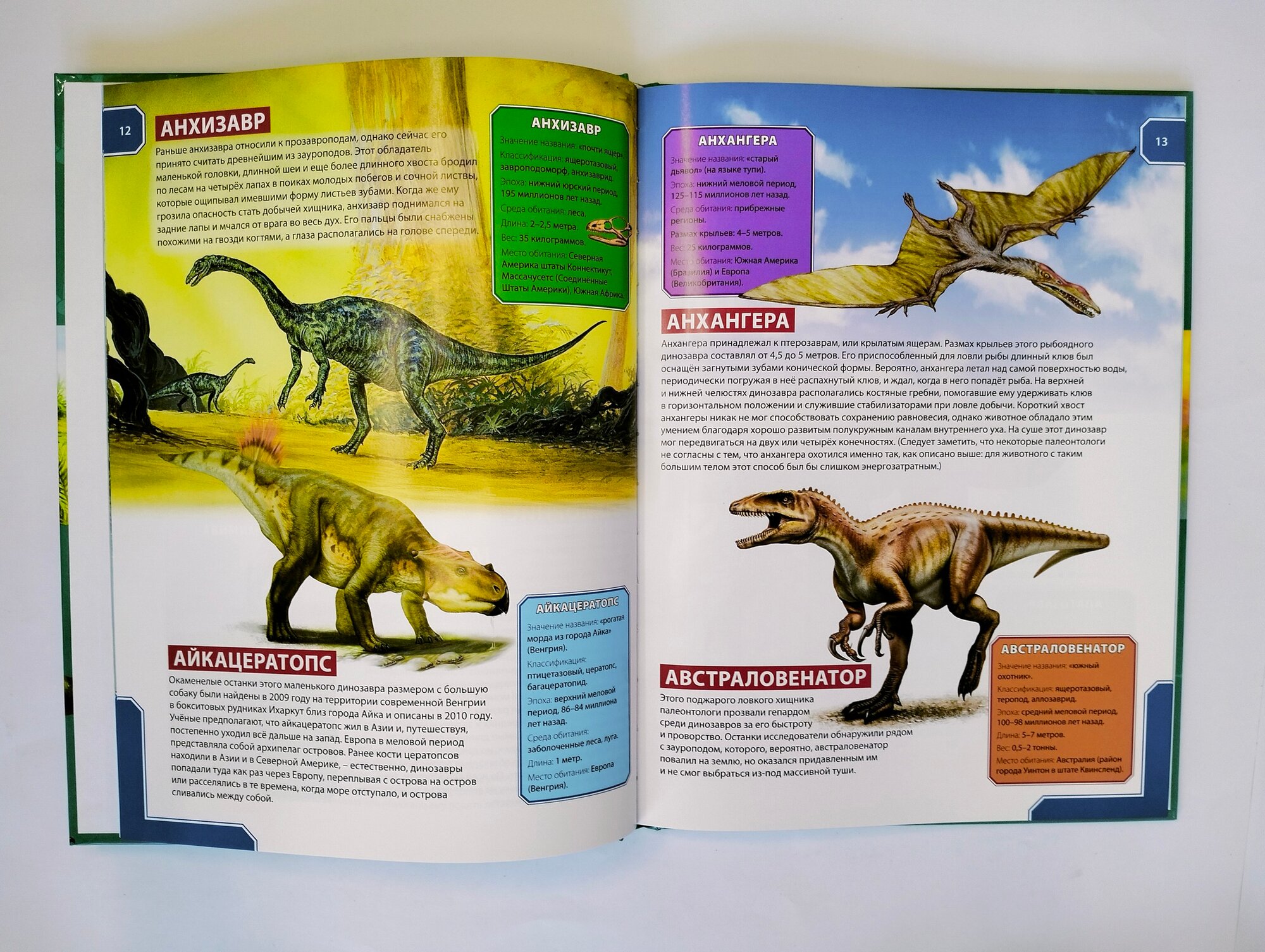 Несмотря на такую на первый взгляд совсем детскую обложку, внутри все очень достаточно уже серьезное: нет никаких рисуночков детей, либо улыбающихся динозавров. Наоборот: динозавры все очень натуральные, есть даже иллюстрации борьбы между ними.
