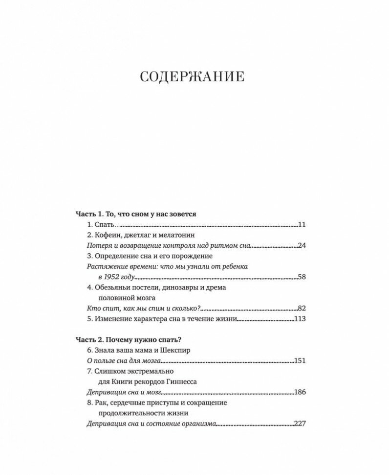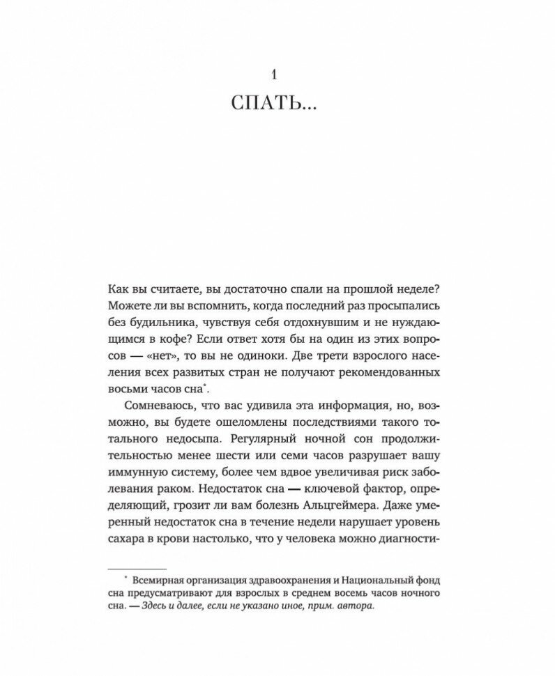 "Сон - это единственное и наиболее эффективное действие, которое мы можем предпринять, чтобы каждый день регулировать работу нашего мозга и тела. Это лучшее оружие матушки-природы в противостоянии смерти. К сожалению, реальные доказательства, разъясняющие все опасности, которым подвергаются человек и общество в случае недосыпания, до сих пор не были в полной мере донесены до людей. Это самое вопиющее упущение в сегодняшних разговорах о здоровье. Исправить его как раз и призвана моя книга, и я очень надеюсь, что она превратится для читателя в увлекательное путешествие, полное открытий. Кроме того, книга нацелена на пересмотр оценки сна и изменение пренебрежительного отношения к нему". (Мэттью Уолкер)