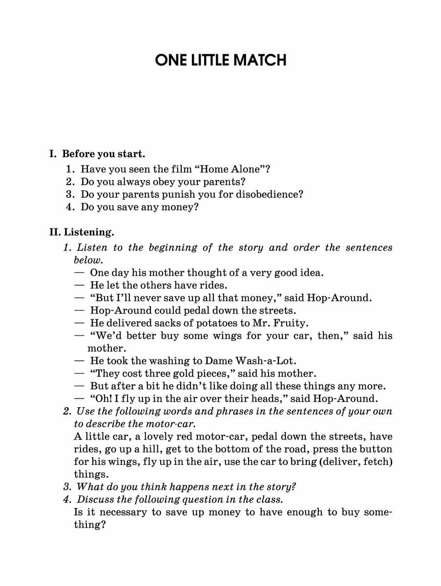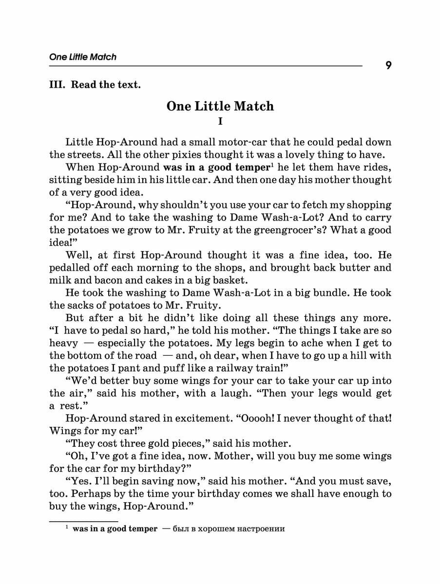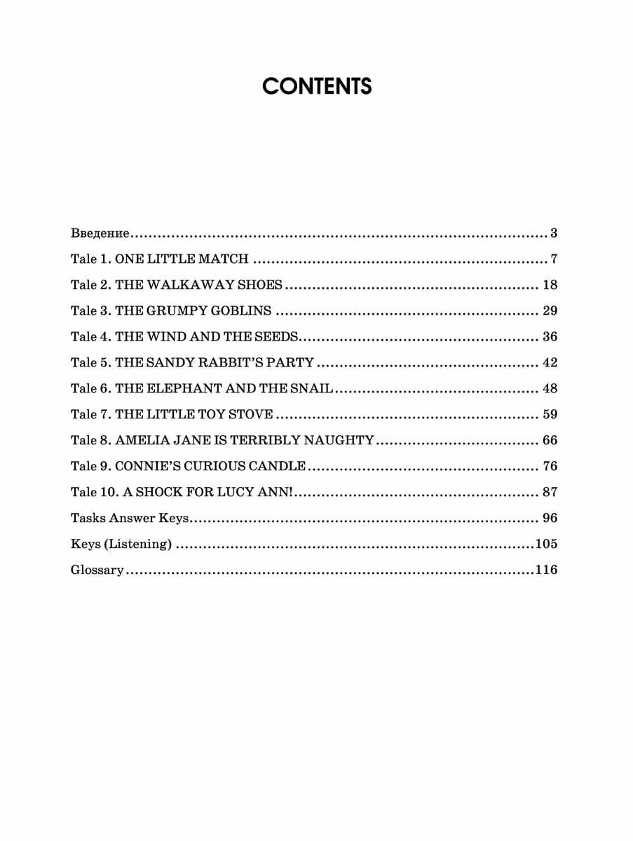 Отличное пособие! Состоит из 10-ти рассказов: One little match, The walkaway shoes, The grumpy goblins, The wind and the seeds, The sandy rabbit's party, The elephant and the snail, The little toy stove, Amelia Jane is terribly naughty, Connie's curious candle, A shock for Lucy Ann! Перед каждой историей содержатся несколько заданий, в том числе на Listening (у моего издания нет диска), после рассказа дается список основного вокабуляра и несколько заданий на понимание, лексику и грамматику. Рекомендовала бы данное пособие для домашнего чтения!