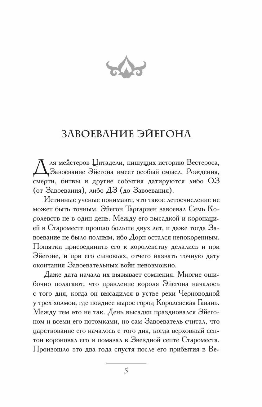 Тирион Ланнистер еще не стал заложником жестокого рока, Бран Старк еще не сделался калекой, а голова его отца Неда Старка еще не скатилась с эшафота. Ни один человек в Королевствах не смеет даже предположить, что Дейенерис Таргариен когда-нибудь назовут Матерью Драконов. Вестерос не привел к покорности соседние государства, и Железный Трон, который, согласно поговорке, ковался в крови и пламени, далеко еще не насытился. Древняя, как сам мир, история сходит со страниц ветхих манускриптов, и только мы, септоны, можем отделить правдивые события от жалких басен, и истину от клеветнических наветов.