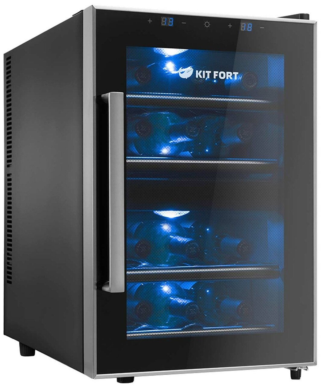 Винный шкаф Kitfort прекрасно впишется в любой интерьер за счет черного корпуса из металла и стекла. Дверца практически прозрачная, перевешивается справа налево, легко открывается и закрывается, не давая содержимому упасть. Модель отличается низким уровнем шума 41 дБ, что практически не слышимо во время его работы, о себе устройство будет напоминать только радующим глаз стильным дизайном. В год шкаф потребляет всего 183 кВтч электроэнергии, разделен на 4 разных отсека для каждого вида вина.