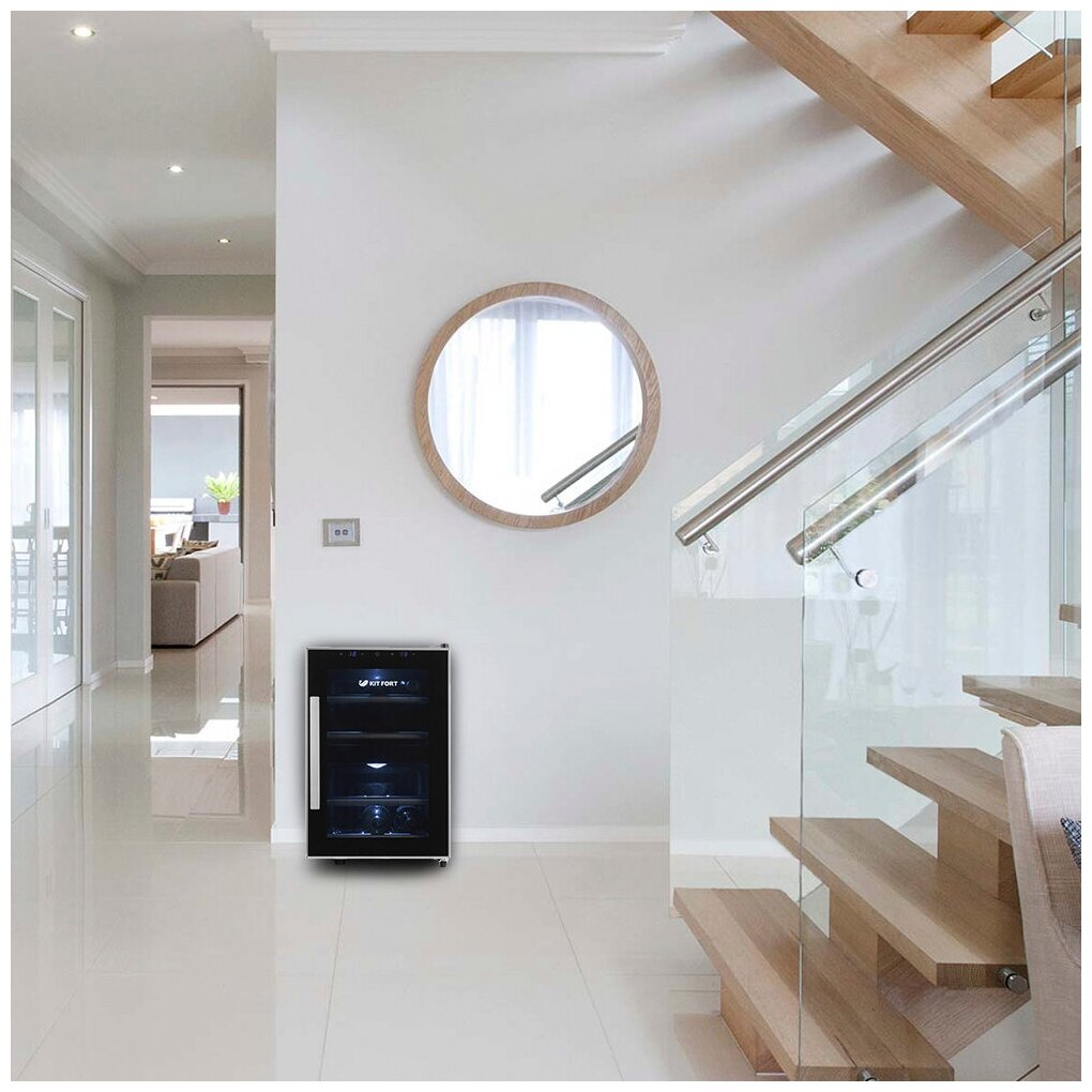 Kitfort обладает большой вместительностью – до 34 л или 12 стандартных 0.75 л бутылок, чего более чем достаточно для домашнего пользования или в небольших ресторанах, кафе и барах. Для разных видов вина есть возможность установить в одной части шкафа определенную температуру, в другой – иную, при помощи сенсорного управления.