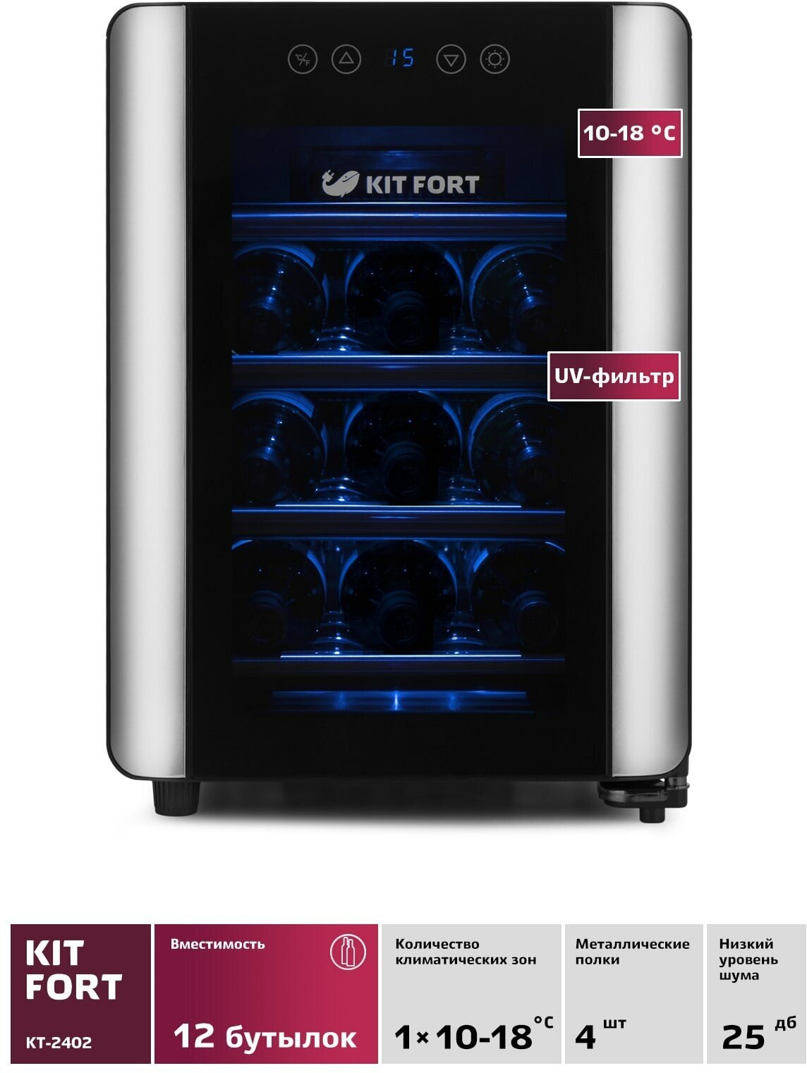 Винный шкаф Kitfort KT-2402 — это холодильник для хранения вина в бутылках. В винном шкафу имеются двенадцать лотков для укладки бутылок, расположенных на съемных полках. Дверца шкафа прозрачная, в ее верхней части расположена сенсорная панель управления со светодиодным дисплеем. Охлаждение производится при помощи термоэлементов Пельтье, поэтому в винном шкафу не используется никаких вредных хладагентов, а уровень шума меньше, чем у компрессорных холодильников, и отсутствуют вибрации.