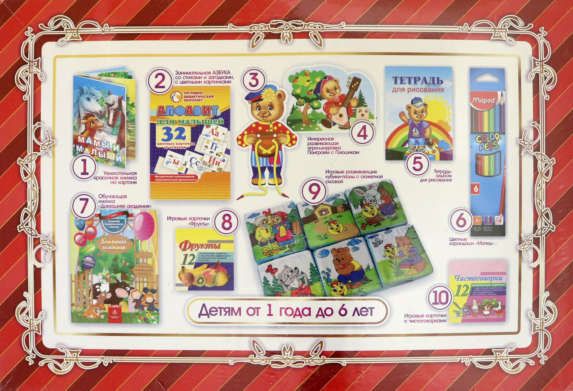 Подарочный набор Лучший подарок малышу - это замечательная чудо-коробка, от которой каждый ребенок будет в восторге и которую ему будет очень радостно получить к любому празднику, приятному событию, к моменту нового возрастного периода или к памятной дате, а также просто в качестве сюрприза, чтобы вместе с друзьями, семьей или самому с удовольствием играть, читать, считать, учиться, заниматься творчеством.Подарочный набор 10 в 1 (десять в одном) включает в себя всё, что очень любят малыши, всё, чем им не терпится всегда заняться, всё, что поможет Вам, уважаемые взрослые, мотивировать и стимулировать ребенка к полезной для него развивающей и обучающей деятельности:1) увлекательную красочную книжку на картоне Мамы и малыши,2) занимательную азбуку со стихами, загадками и цветными картинками,3) интересную развивающую игру-шнуровку Угостим Плюшика медом в горшочке,4) интересную развивающую игру-шнуровку Поиграем с Плюшиком,5) тетрадь-альбом для рисования,6) цветные карандаши,7) обучающую книжку Домашняя академия,8) игровые карточки Фрукты,9) игровые развивающие кубики-пазлы с сюжетной сказкой Колобок,10) игровые карточки с чистоговорками.Хотите, чтоб дети умелыми, умными были,Мыслить учились и думать, творили?Супер-умнейший подарок - что надо!Станет ребёнку учёба наградой!