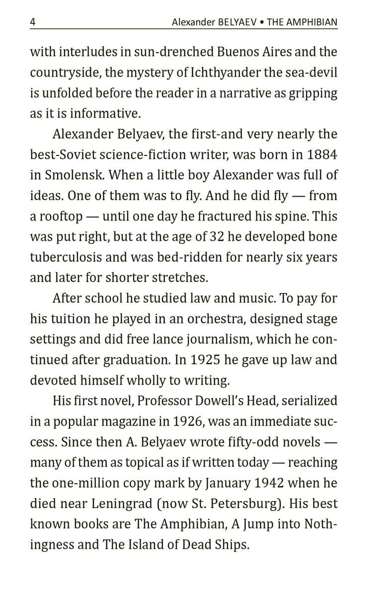 Alexander Belyaev (1884-1942) is one of the founders of Russian science fiction literature and the first of the Soviet writers to devote himself entirely to this genre. In all, he has written more than 70 science fiction works, including 17 novels. For a significant contribution to Russian fiction and his visionary ideas, Belyaev is often called the "Russian Jules Verne."